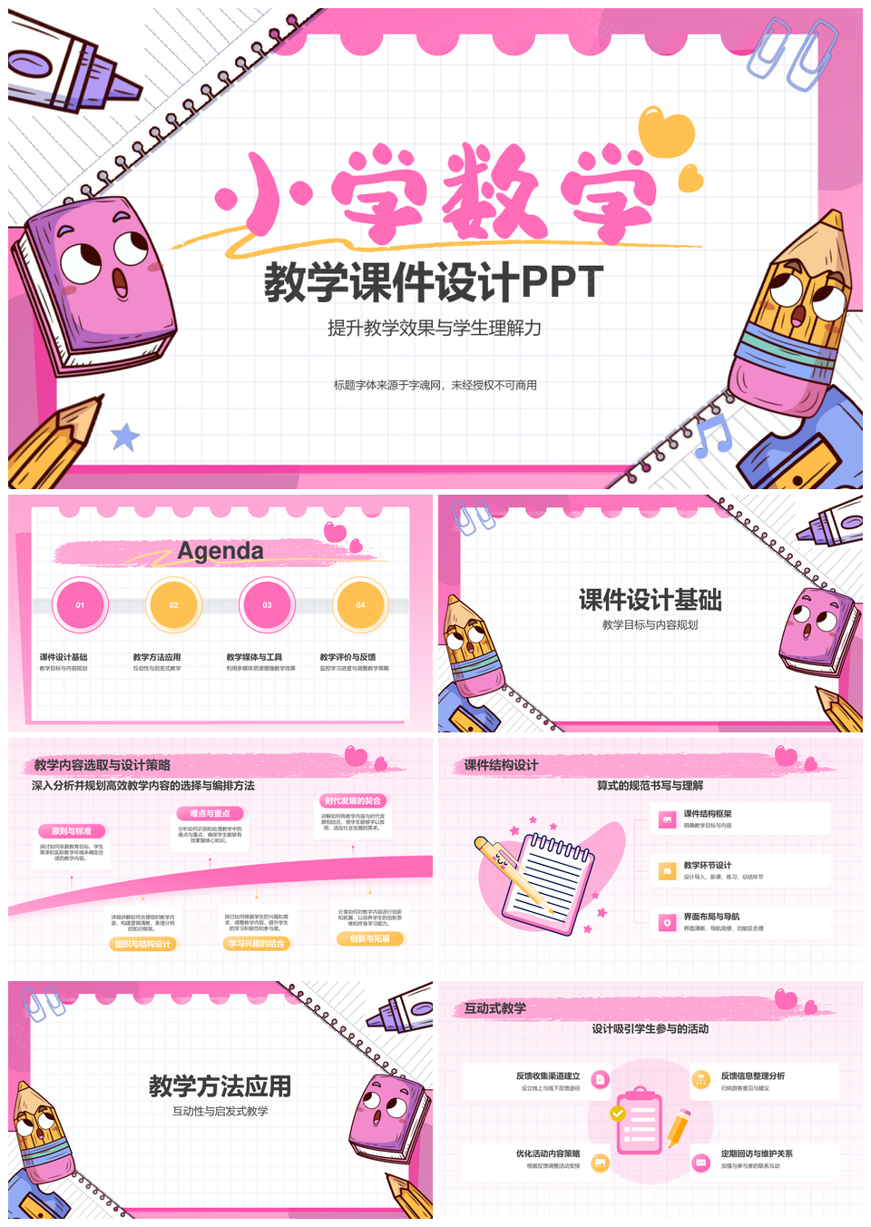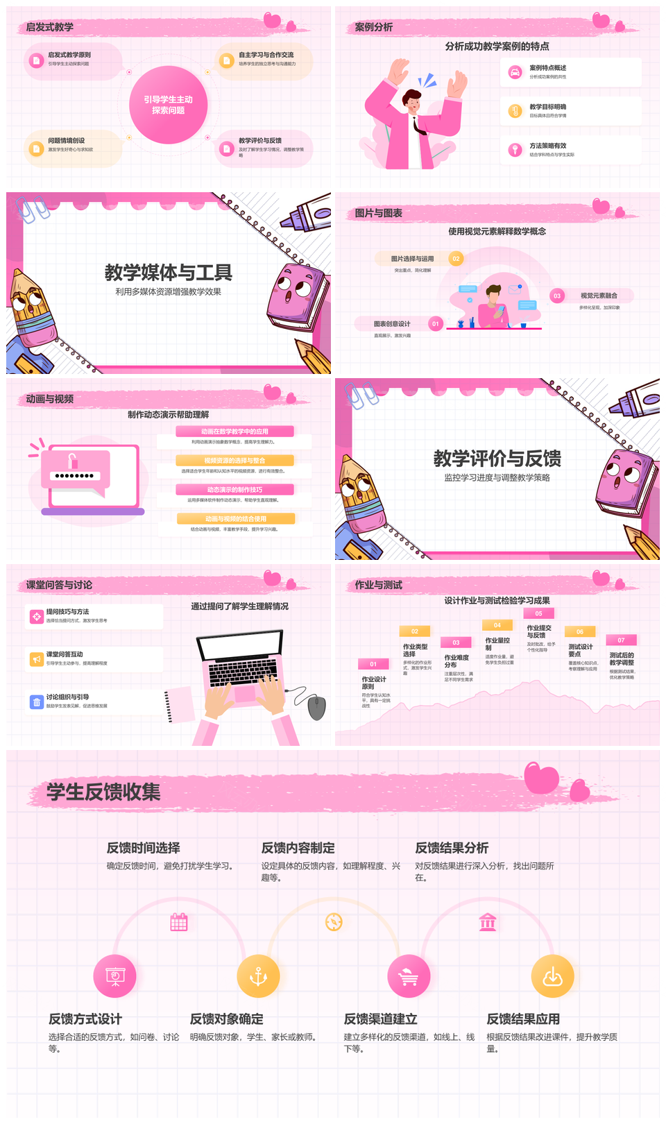 这款PPT模板以粉色为主调,融合插画风手绘元素,营造出温暖治愈的视觉氛围。页面中包含原创手绘插图,采用柔和线条与童趣图案,兼顾专业场景的可视化需求,内容框架层级分明,逻辑呈现清晰有序。模板适用于教育课件、儿童品牌提案或创意方案汇报,在严谨的版式布局中融入适当的留白与点缀性插画,既降低阅读压力,又保持视觉吸引力。所有设计细节均考虑信息传达效率,科学设计的分区布局与配色方案,在保持专业性的同时传递轻松质感,适合需要平衡亲和力与内容严谨度的演示场景。