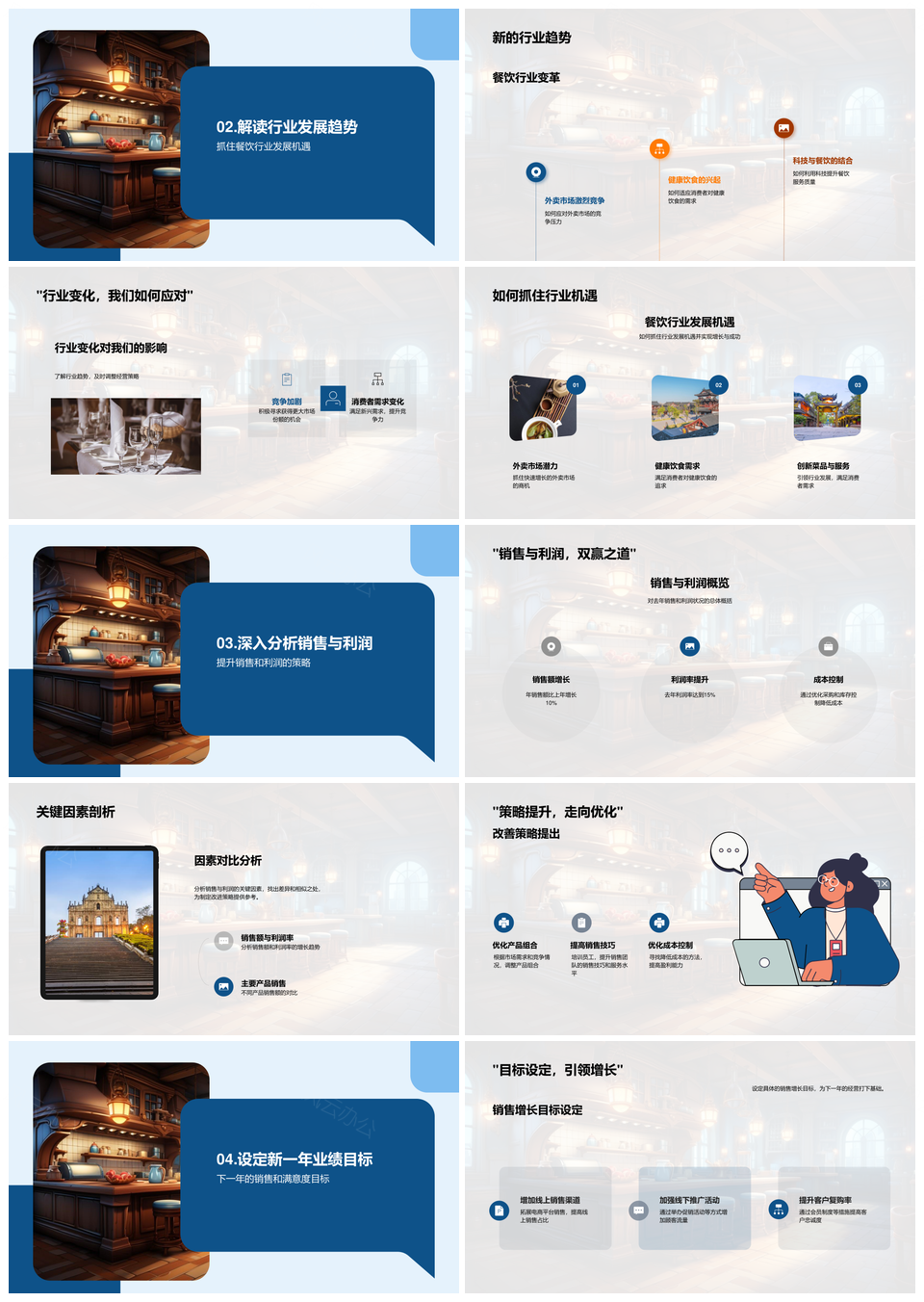 这是一张食道先锋年度业绩趋势与餐饮业策略展望PPT模板,包含食道先锋、年度业绩趋势、餐饮业、策略展望等主题内容,也可用作食道先锋年度业绩趋势、年度业绩趋势餐饮业、业绩趋势餐饮业策略、趋势餐饮业策略展望、食道先锋年度业绩、年度业绩趋势、业绩趋势餐饮业、趋势餐饮业策略、餐饮业策略展望、食道先锋年度、年度业绩、业绩趋势、趋势餐饮业、餐饮业策略、策略展望等PPT场景使用。 风云办公提供的食道先锋年度业绩趋势与餐饮业策略展望PPT模板,下载格式为pptx,一共26页,作品中文字及图均可以修改和编辑,图片更改请在作品中右键图片并更换,文字修改请直接点击文字进行修改。