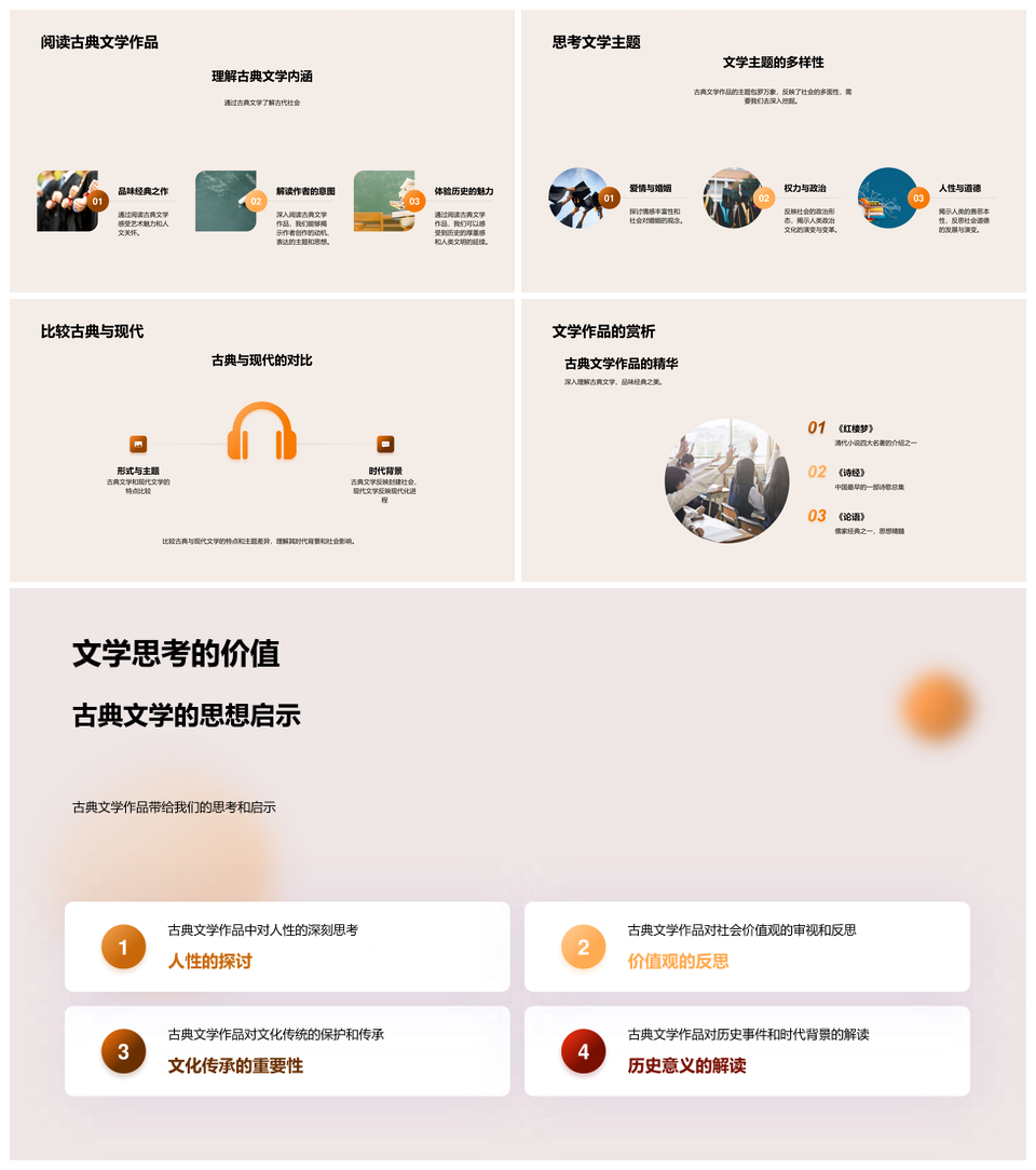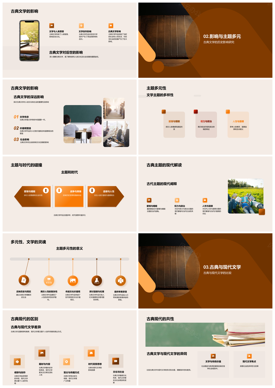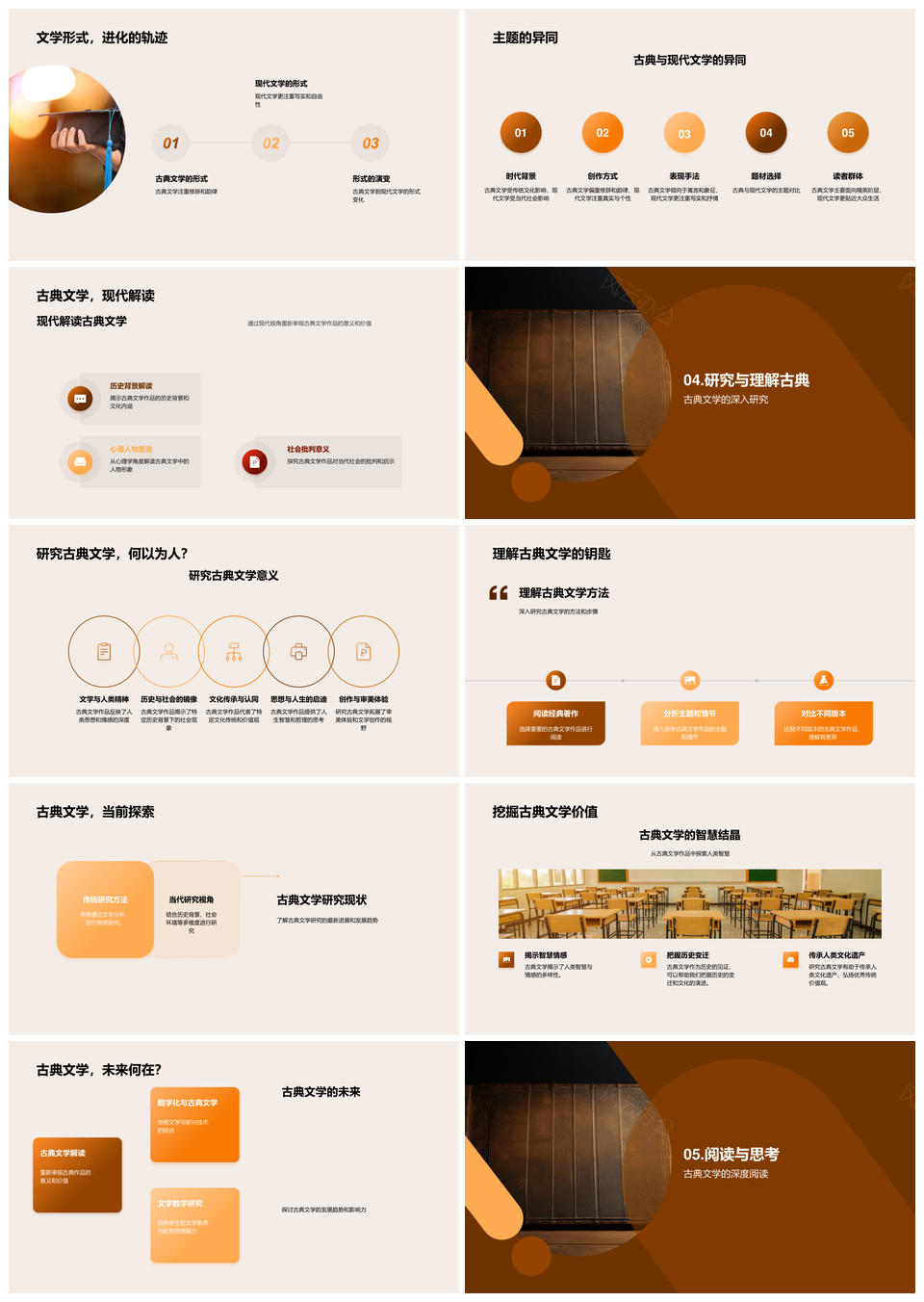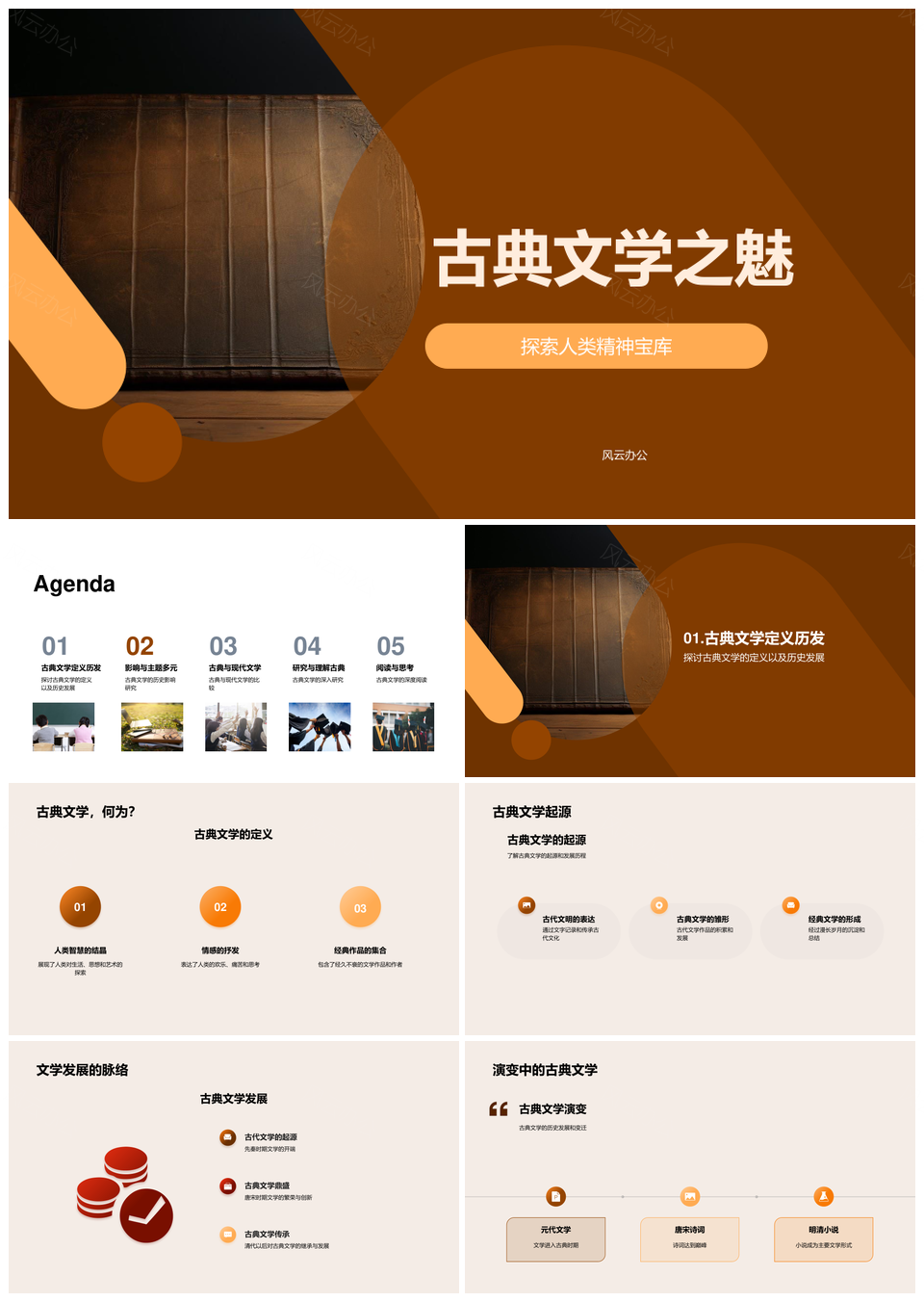风云办公提供的古典现代文学主题探源人类精神宝库PPT模板,下载格式为pptx,一共33页,作品中文字及图均可以修改和编辑,图片更改请在作品中右键图片并更换,文字修改请直接点击文字进行修改。