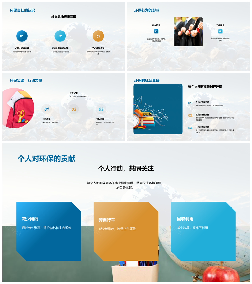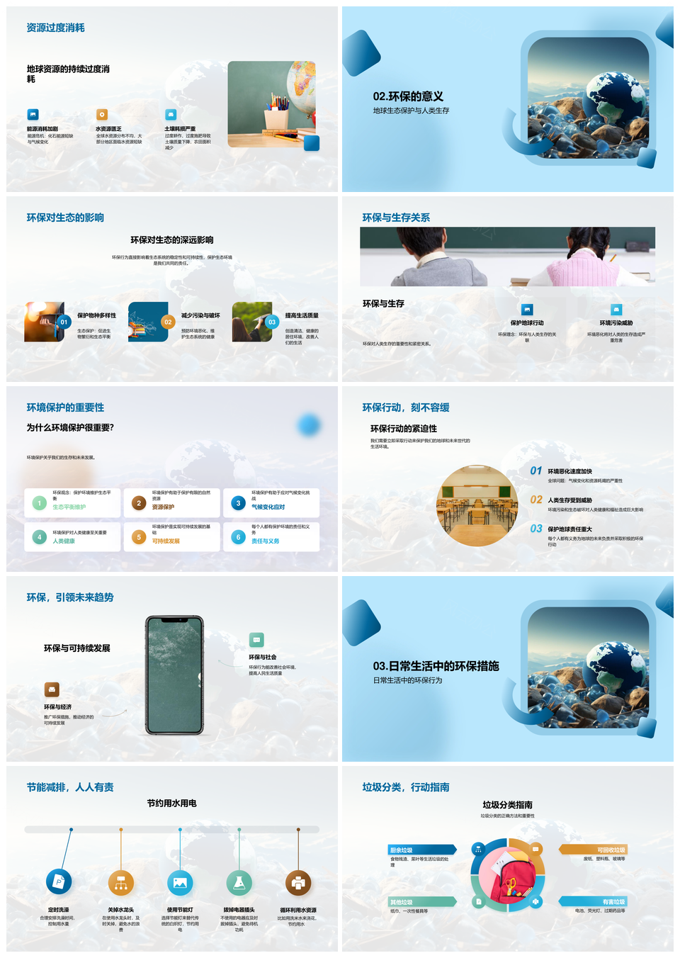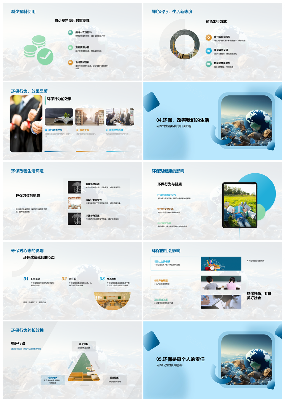 这款模板以浅蓝与天蓝为基调,搭配草绿至墨绿的渐变层次,还原自然光影的呼吸感,视觉上轻盈柔和。日系清新的版式设计,通过留白与低饱和色块构建呼吸感,结合枝叶、水纹等森系图形元素,弱化复杂信息的视觉压力。适合教育课件、环保主题、品牌提案等场景,兼顾专业性与氛围感,主次分明的页面逻辑确保内容直观呈现,降低观众的理解成本,专注传递核心信息。
