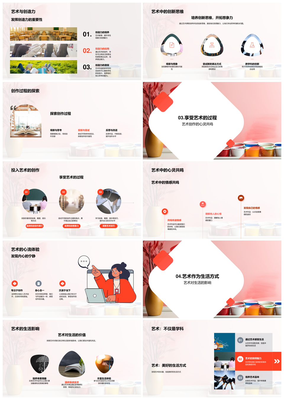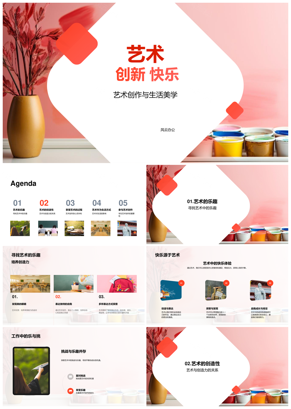 风云办公提供的艺术创新悦享生活美学提升审美能力PPT模板,下载格式为pptx,一共23页,作品中文字及图均可以修改和编辑,图片更改请在作品中右键图片并更换,文字修改请直接点击文字进行修改。