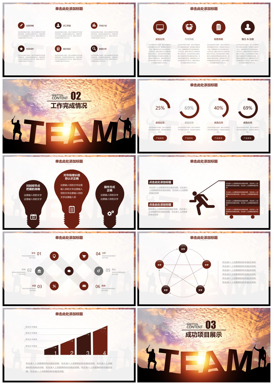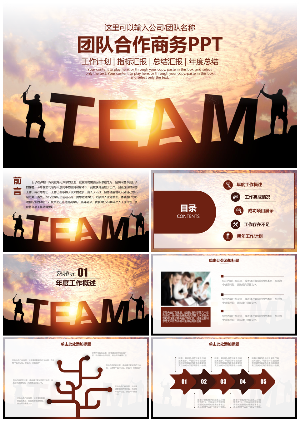 这是一张商务风团队合作工作计划总结通用PPT模板,包含商务风、团队、合作、工作计划、总结等主题内容,也可用作商务风、团队、合作、工作计划、总结 商务风团队合作工作计划、团队合作工作计划总结、商务风团队合作、团队合作工作计划、工作计划总结、商务风团队、团队合作、工作计划总结等PPT场景使用。 风云办公提供的商务风团队合作工作计划总结通用PPT模板,下载格式为pptx,一共36页,作品中文字及图均可以修改和编辑,图片更改请在作品中右键图片并更换,文字修改请直接点击文字进行修改。