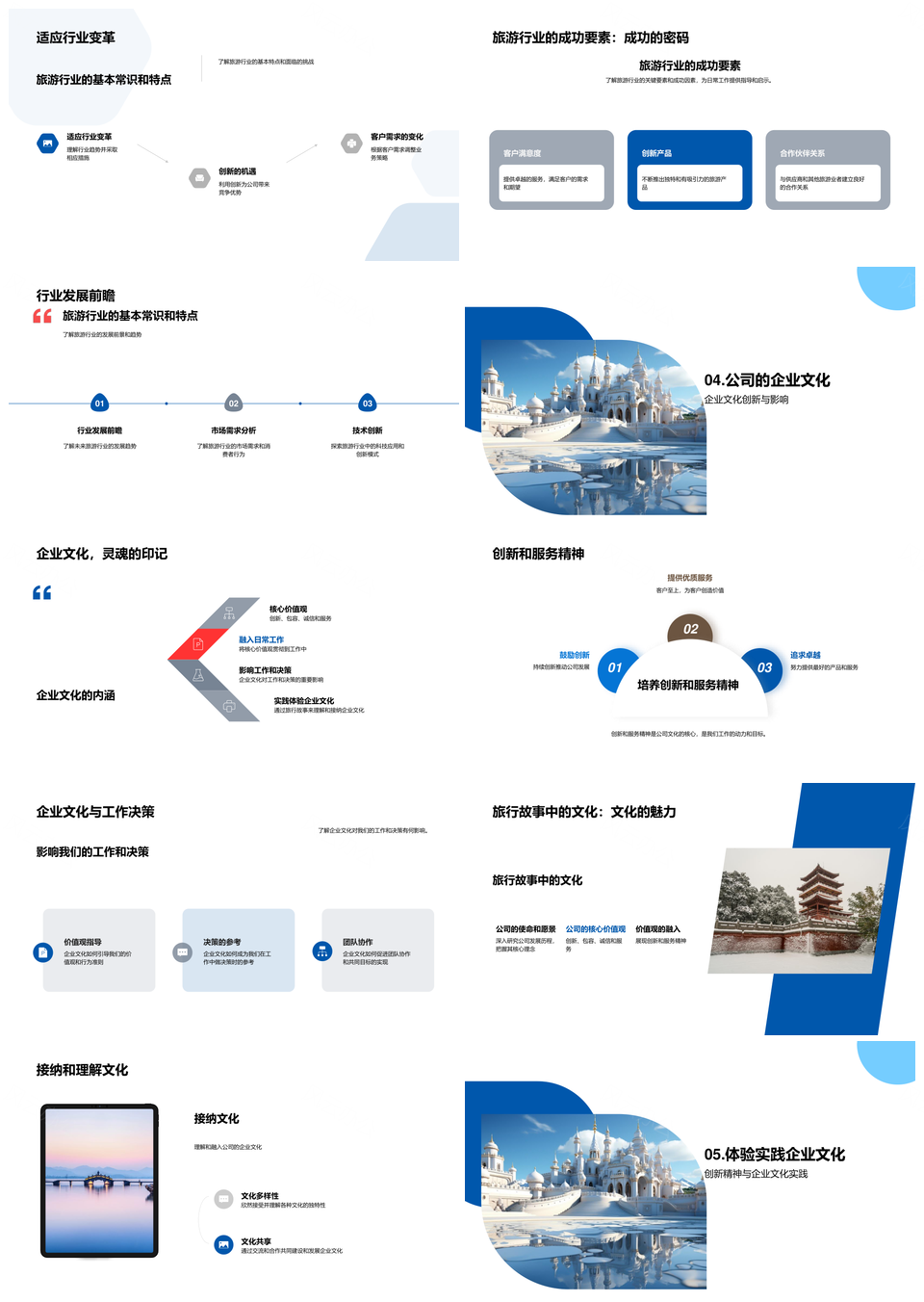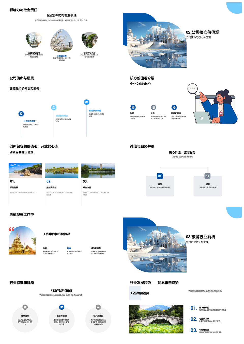 这是一张旅游企业文化新员工培训使命愿景旅行故事PPT模板,包含旅游、企业、文化、新员工、培训、使命、愿景、旅行、故事等主题内容,也可用作旅游企业新员工培训、企业文化新员工培训、新员工培训使命愿景、使命愿景旅行故事、企业文化培训使命、企业新员工使命愿景、培训使命愿景故事、旅游企业使命愿景、新员工旅行故事、企业文化愿景、旅游培训愿景、企业旅行故事、使命愿景旅行、新员工培训、旅行故事等PPT场景使用。 风云办公提供的旅游企业文化新员工培训使命愿景旅行故事PPT模板,下载格式为pptx,一共33页,作品中文字及图均可以修改和编辑,图片更改请在作品中右键图片并更换,文字修改请直接点击文字进行修改。