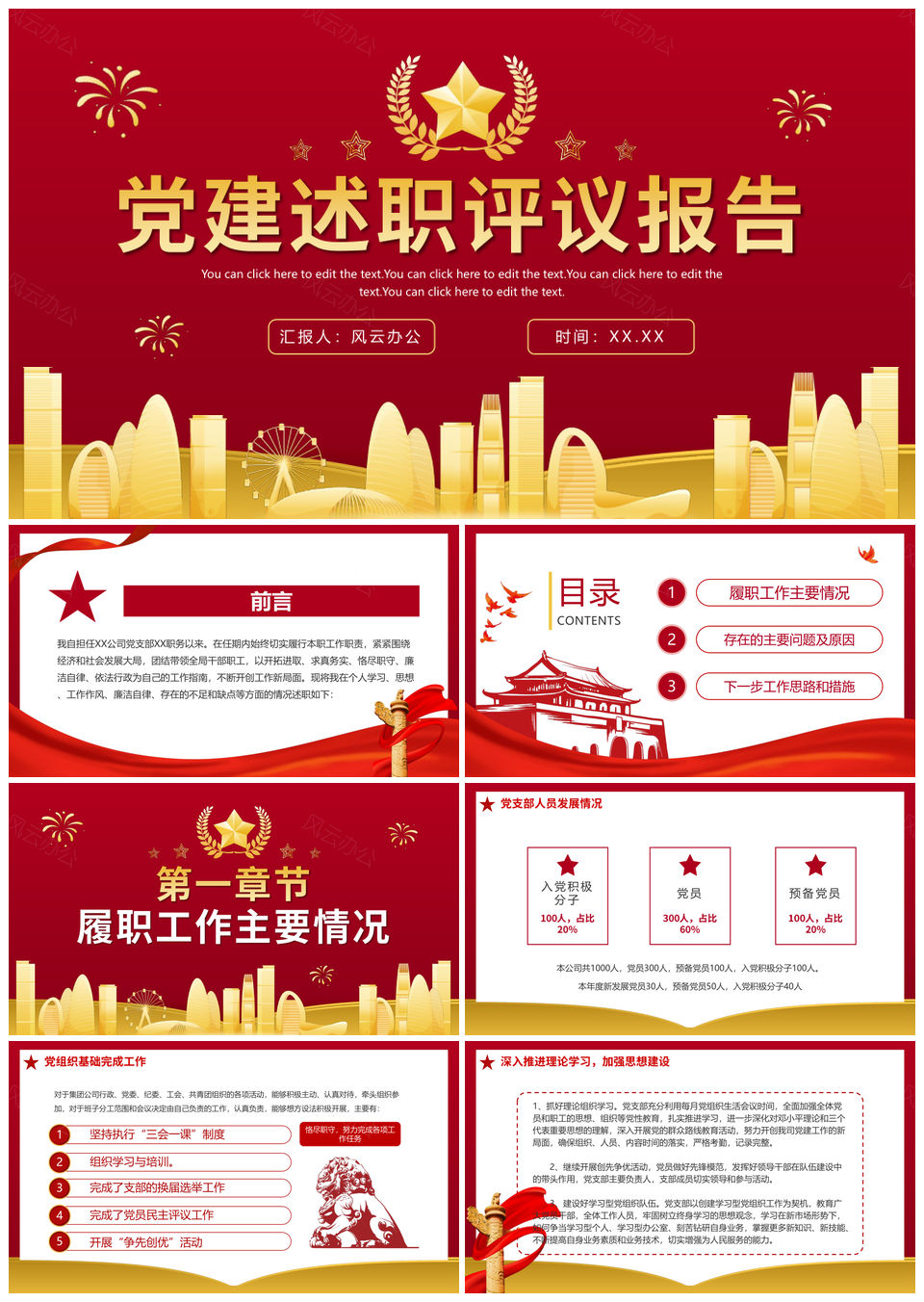 风云办公提供的金色党建引领基层述职工作汇报总结PPT模板,下载格式为pptx,一共23页,作品中文字及图均可以修改和编辑,图片更改请在作品中右键图片并更换,文字修改请直接点击文字进行修改。