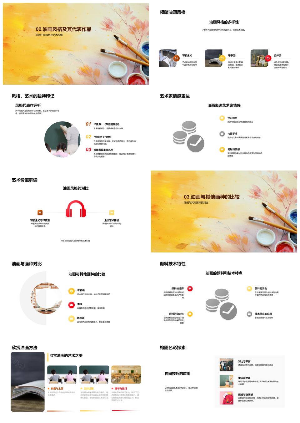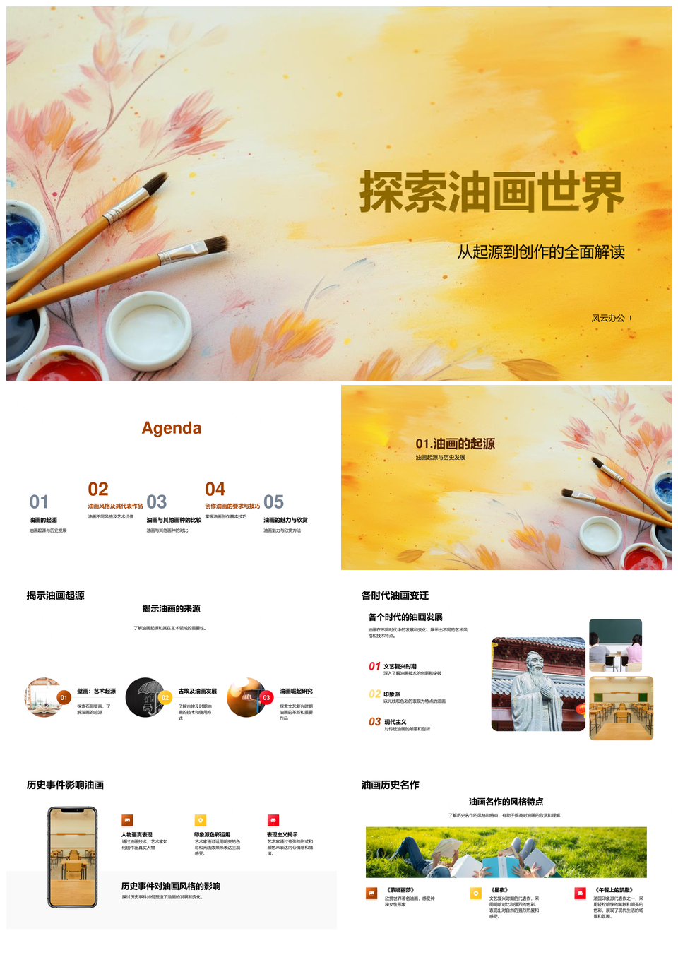 风云办公提供的油画艺术起源创作技法与风格探析PPT模板,下载格式为pptx,一共28页,作品中文字及图均可以修改和编辑,图片更改请在作品中右键图片并更换,文字修改请直接点击文字进行修改。