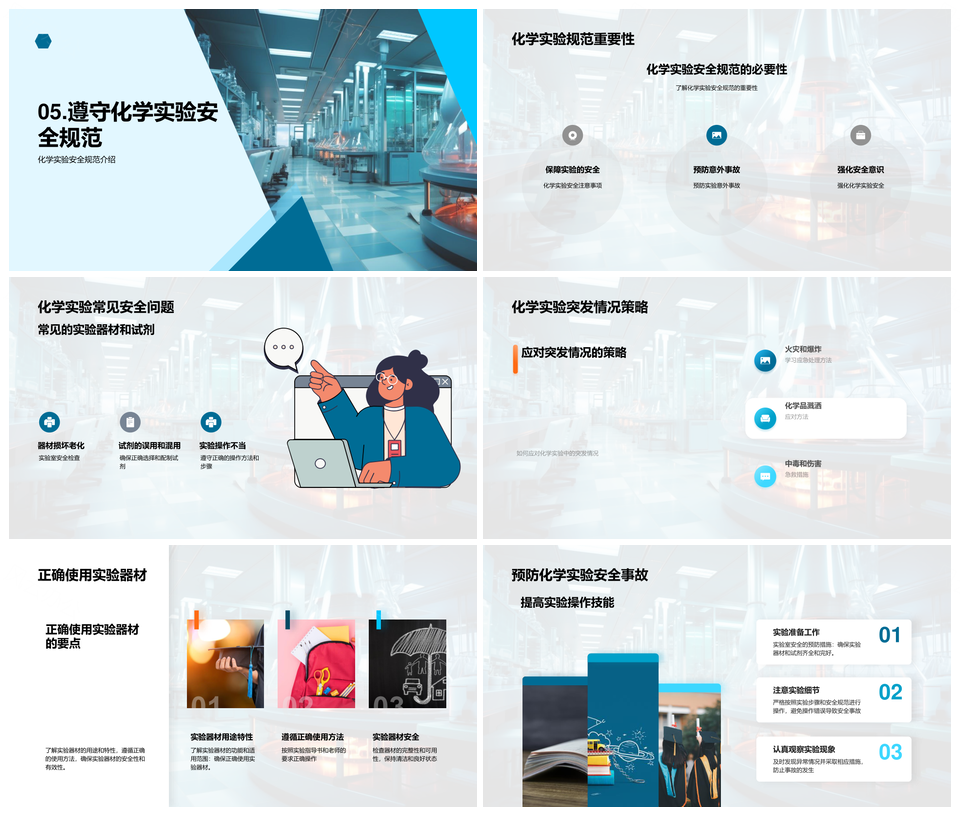 这是一张化学实验安全规范正确使用器材试剂预防事故PPT模板,包含化学实验、安全规范、正确、使用、器材、试剂、预防、事故等主题内容,也可用作化学实验安全规范正确使用器材、安全规范正确使用器材试剂、正确使用器材试剂预防事故、化学实验安全规范正确使用、安全规范正确使用器材、正确使用器材试剂、器材试剂预防事故、化学实验安全规范、安全规范正确使用、正确使用器材、正确使用试剂、器材试剂、试剂预防事故、安全规范预防事故、化学实验预防事故等PPT场景使用。 风云办公提供的化学实验安全规范正确使用器材试剂预防事故PPT模板,下载格式为pptx,一共24页,作品中文字及图均可以修改和编辑,图片更改请在作品中右键图片并更换,文字修改请直接点击文字进行修改。