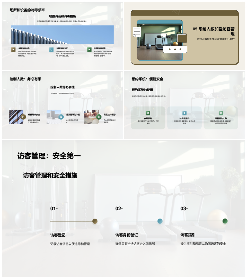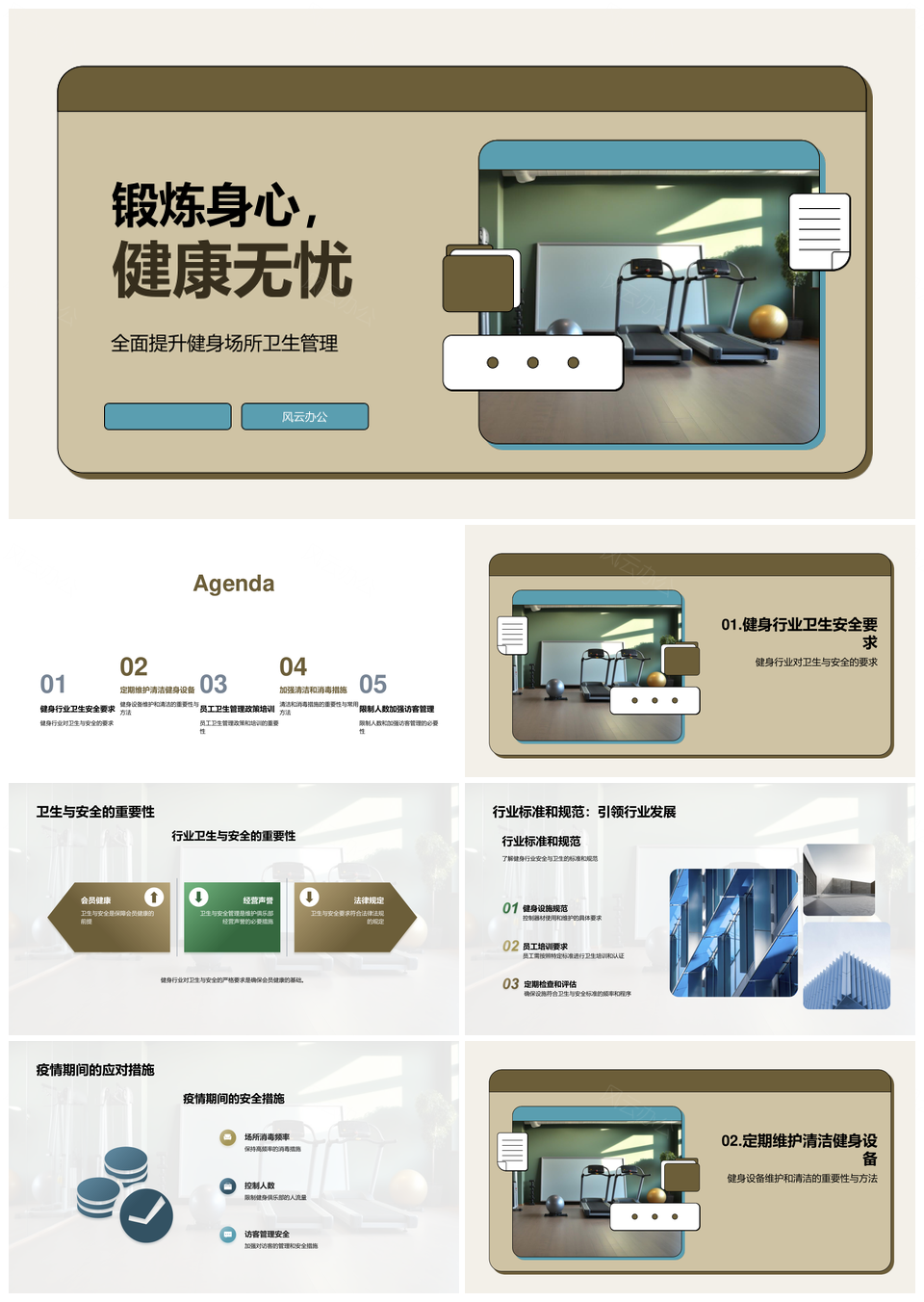 风云办公提供的健身行业疫情期安全卫生规范管理PPT模板,下载格式为pptx,一共23页,作品中文字及图均可以修改和编辑,图片更改请在作品中右键图片并更换,文字修改请直接点击文字进行修改。