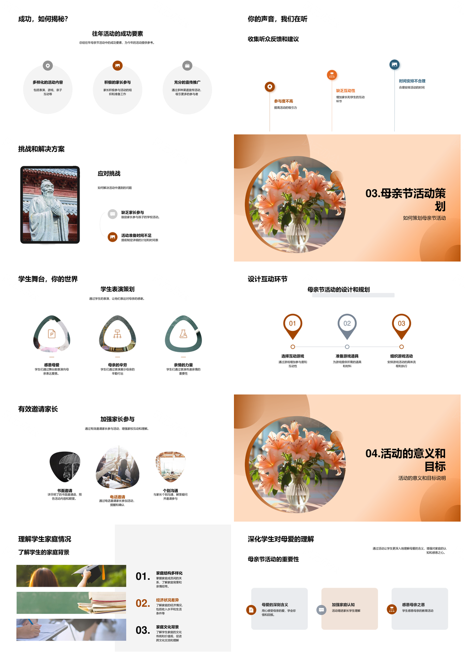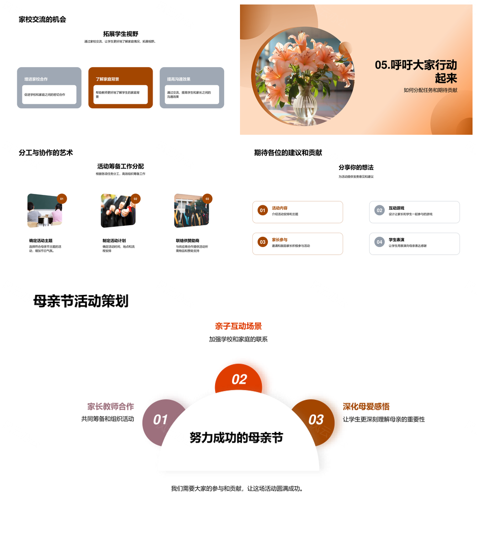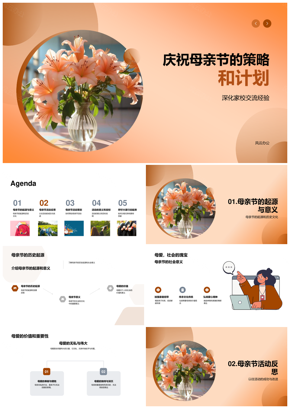 这是一张家校母亲节活动策划会议家长互动游戏花束PPT模板,包含家校、母亲节、活动策划、会议、家长、互动游戏、花束等主题内容,也可用作家校母亲节活动策划、母亲节活动策划会议、活动策划会议家长、策划会议家长互动游戏、会议家长互动游戏花束、家校母亲节活动、母亲节活动策划、活动策划会议、策划会议家长、会议家长互动游戏、家长互动游戏花束、家校母亲节策划会议、母亲节策划会议家长、活动策划家长互动游戏、策划会议互动游戏花束等PPT场景使用。 风云办公提供的家校母亲节活动策划会议家长互动游戏花束PPT模板,下载格式为pptx,一共23页,作品中文字及图均可以修改和编辑,图片更改请在作品中右键图片并更换,文字修改请直接点击文字进行修改。