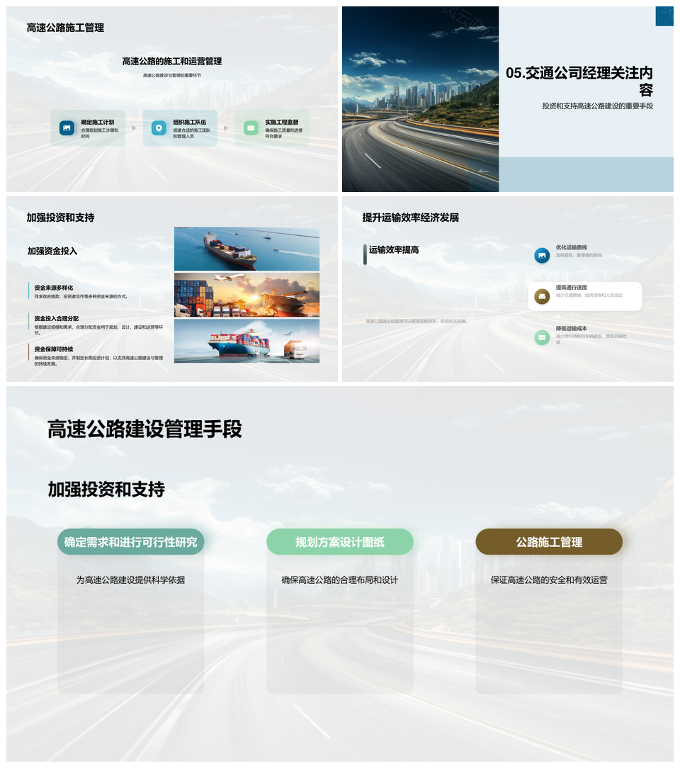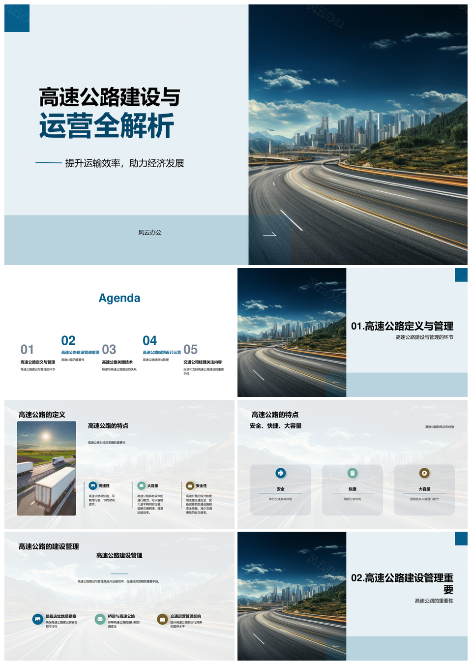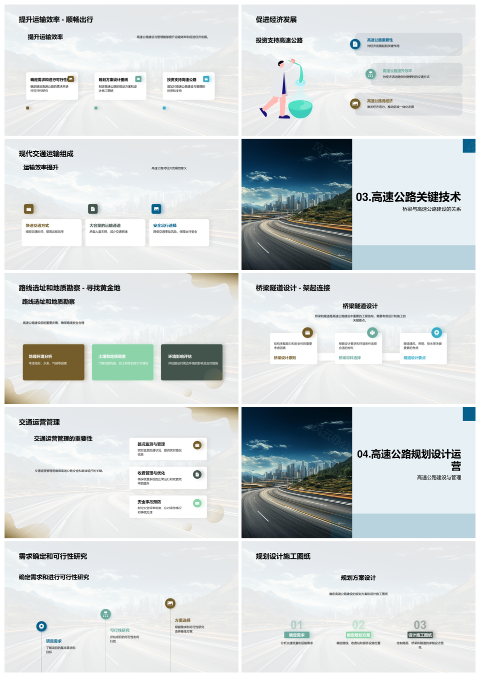 这是一张高速公路建设规划设计运营管理交通效率PPT模板,包含高速公路、建设、规划、设计、运营、管理、交通、效率等主题内容,也可用作高速公路建设规划设计、建设规划设计运营、规划设计运营管理、设计运营管理交通、运营管理交通效率、高速公路建设规划、建设规划设计、规划设计运营、设计运营管理、运营管理交通、管理交通效率、高速公路建设、建设规划、规划设计、设计运营等PPT场景使用。 风云办公提供的高速公路建设规划设计运营管理交通效率PPT模板,下载格式为pptx,一共23页,作品中文字及图均可以修改和编辑,图片更改请在作品中右键图片并更换,文字修改请直接点击文字进行修改。
