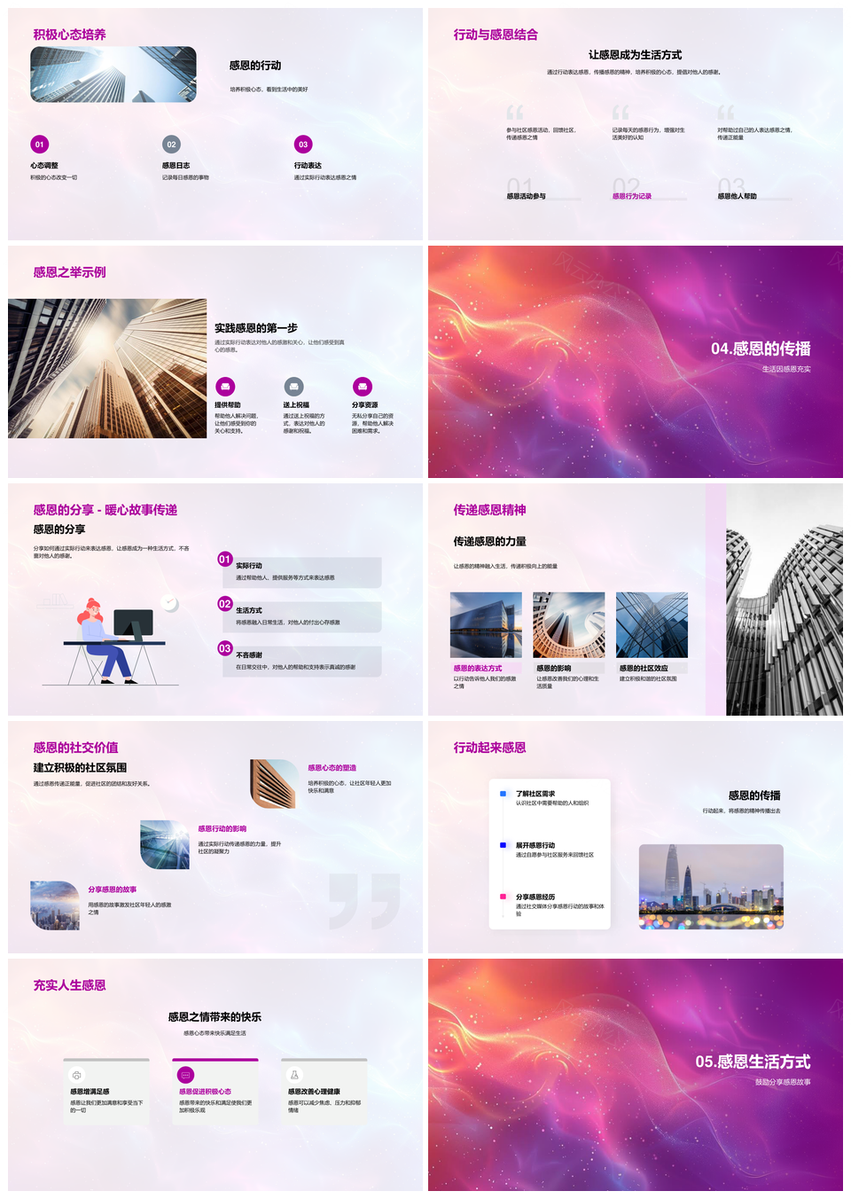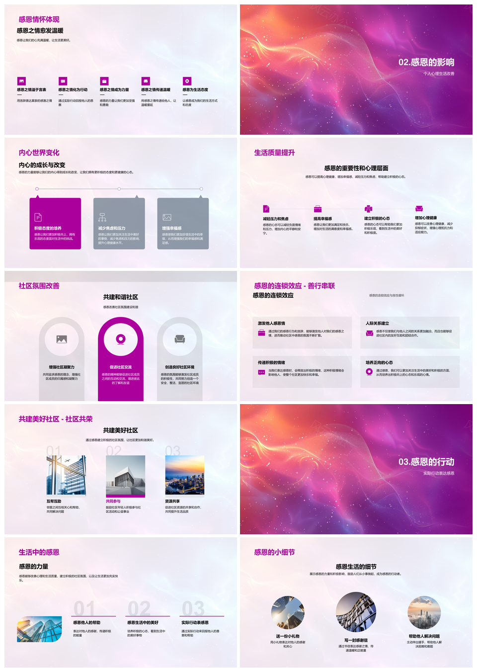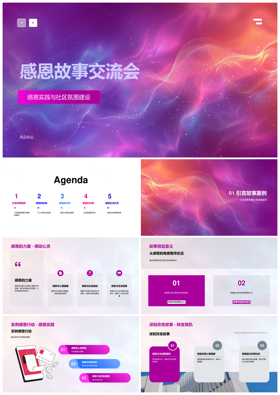 风云办公提供的社区感恩故事实践交流会改善心理生活PPT模板,下载格式为pptx,一共33页,作品中文字及图均可以修改和编辑,图片更改请在作品中右键图片并更换,文字修改请直接点击文字进行修改。