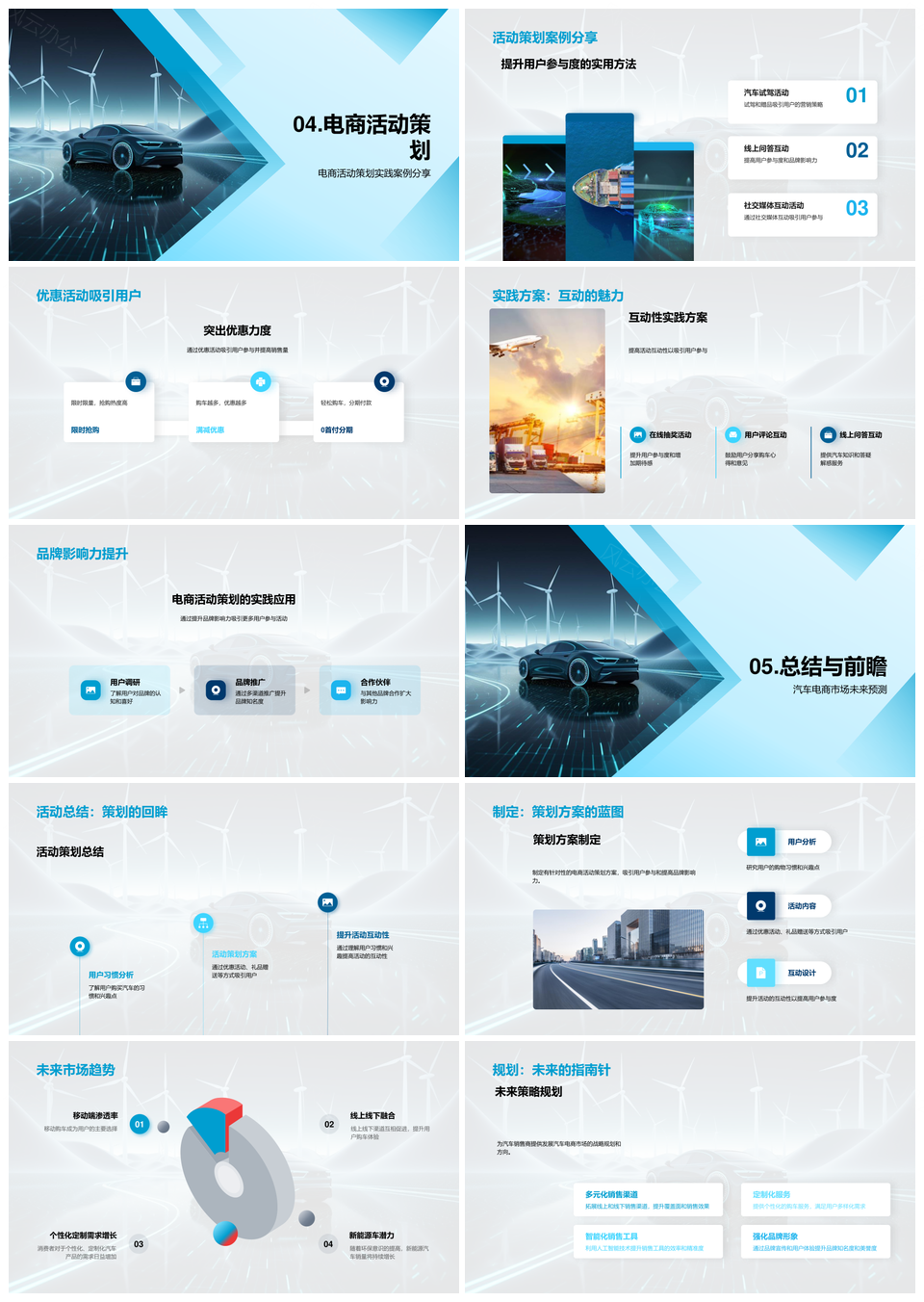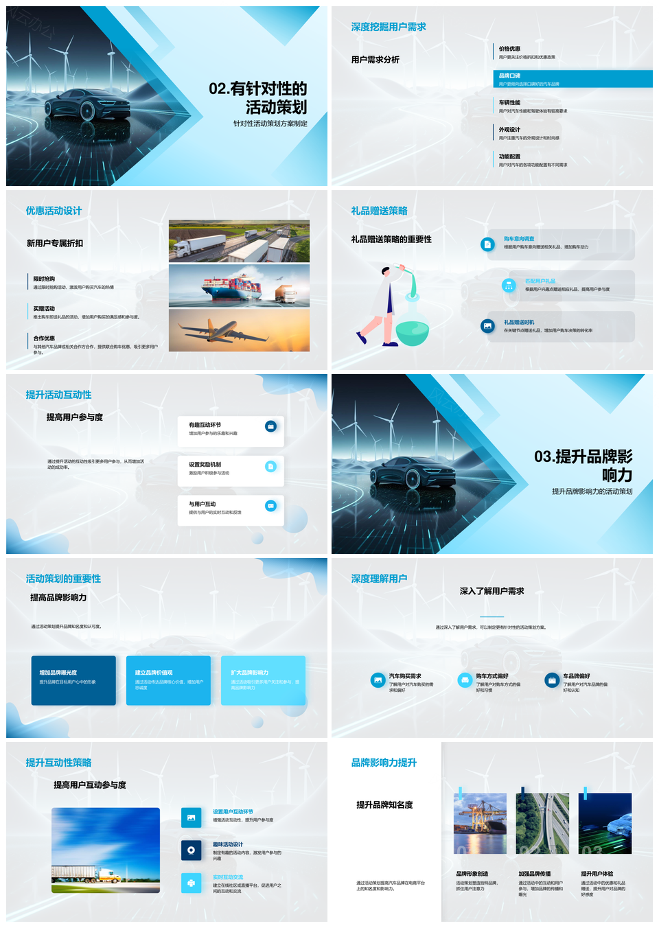 这是一张汽车电商活动策划用户兴趣优惠赠礼互动电动汽车PPT模板,包含汽车、电商、活动、策划、用户、兴趣、优惠、赠礼、互动、电动、汽车等主题内容,也可用作汽车电商活动策划、电动汽车优惠赠礼互动、用户兴趣优惠赠礼、活动策划用户兴趣、优惠赠礼互动电动汽车、电商优惠赠礼互动、优惠赠礼互动、活动策划用户、用户兴趣优惠、策划用户兴趣、电动汽车优惠赠礼、汽车电商、活动策划、用户兴趣、优惠赠礼等PPT场景使用。 风云办公提供的汽车电商活动策划用户兴趣优惠赠礼互动电动汽车PPT模板,下载格式为pptx,一共28页,作品中文字及图均可以修改和编辑,图片更改请在作品中右键图片并更换,文字修改请直接点击文字进行修改。
