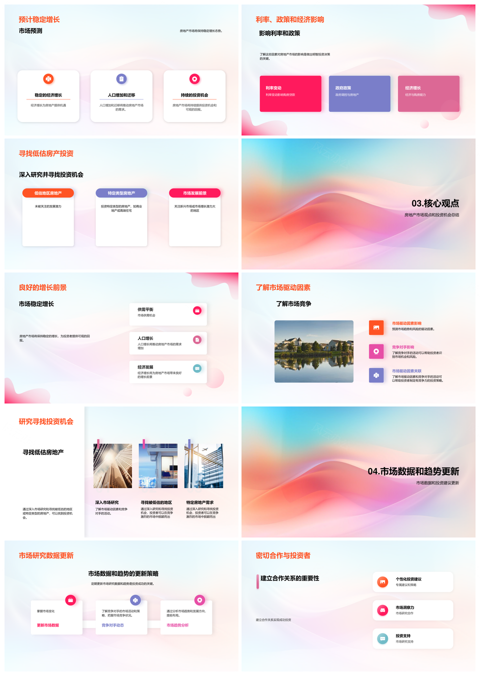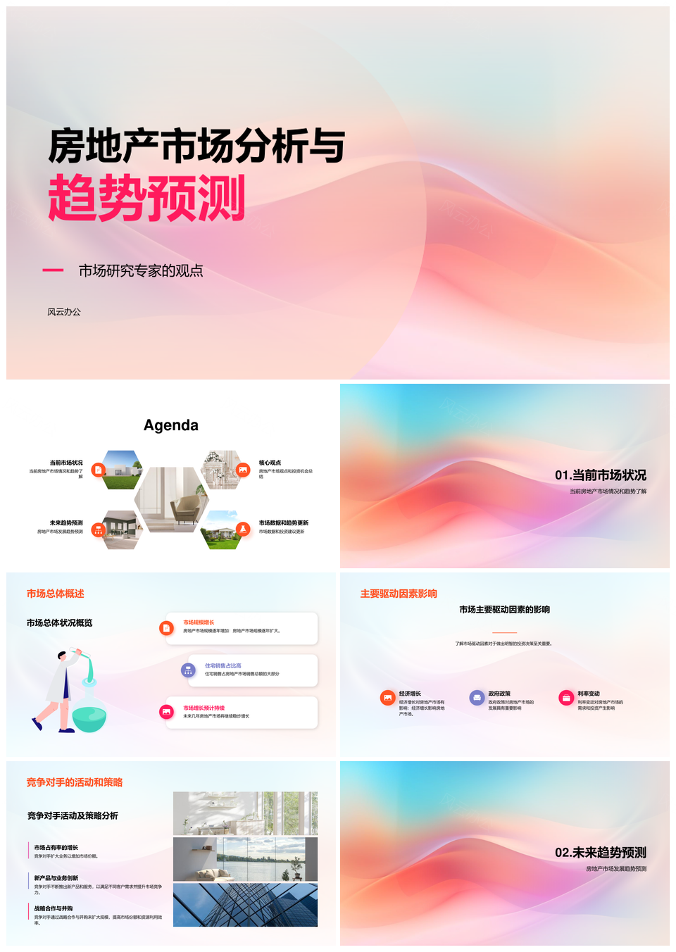 这是一张房地产市场趋势分析预测PPT模板,包含房地产市场、趋势分析、预测等主题内容,也可用作房地产市场趋势分析、市场趋势分析预测、房地产市场趋势、市场趋势分析、趋势分析预测、房地产市场分析、市场分析预测、房地产市场、市场趋势、趋势分析、分析预测、房地产趋势、市场分析、趋势预测、市场预测等PPT场景使用。 风云办公提供的房地产市场趋势分析预测PPT模板,下载格式为pptx,一共19页,作品中文字及图均可以修改和编辑,图片更改请在作品中右键图片并更换,文字修改请直接点击文字进行修改。