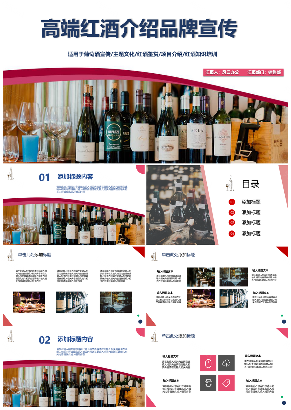 风云办公提供的高端大气红酒介绍品牌宣传PPT模板,下载格式为pptx,一共1页,作品中文字及图均可以修改和编辑,图片更改请在作品中右键图片并更换,文字修改请直接点击文字进行修改。