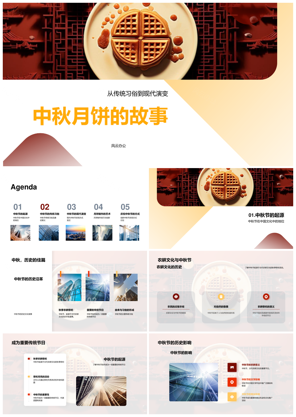 风云办公提供的中秋月饼传统习俗与现代团圆文化PPT模板,下载格式为pptx,一共33页,作品中文字及图均可以修改和编辑,图片更改请在作品中右键图片并更换,文字修改请直接点击文字进行修改。