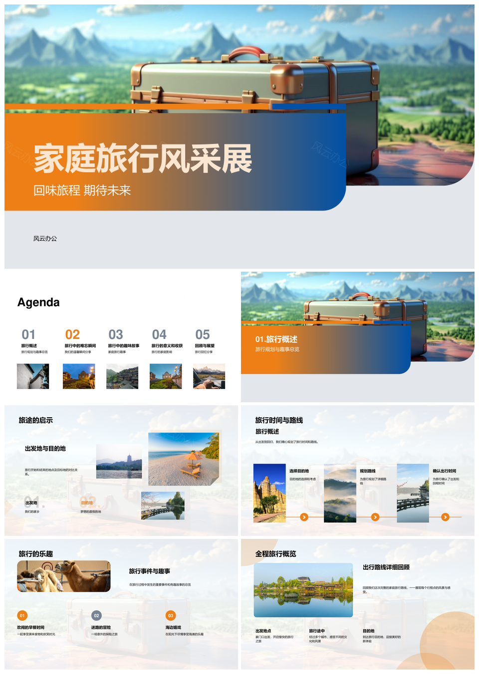 风云办公提供的家庭行囊乐享旅途温情共忆美景趣事PPT模板,下载格式为pptx,一共24页,作品中文字及图均可以修改和编辑,图片更改请在作品中右键图片并更换,文字修改请直接点击文字进行修改。