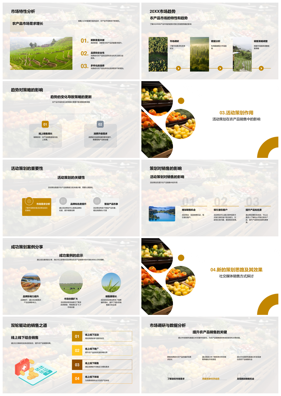 这是一张农产品销售策略框架与生鲜活动策划解析PPT模板,包含农产品、销售策略、框架、生鲜、活动、策划、解析等主题内容,也可用作农产品销售策略框架、生鲜活动策划解析、农产品销售策略、销售策略框架、生鲜活动策划、活动策划解析、农产品销售、销售策略、策略框架、生鲜活动、活动策划、策划解析、农产品策略、生鲜策划、销售框架等PPT场景使用。 风云办公提供的农产品销售策略框架与生鲜活动策划解析PPT模板,下载格式为pptx,一共23页,作品中文字及图均可以修改和编辑,图片更改请在作品中右键图片并更换,文字修改请直接点击文字进行修改。