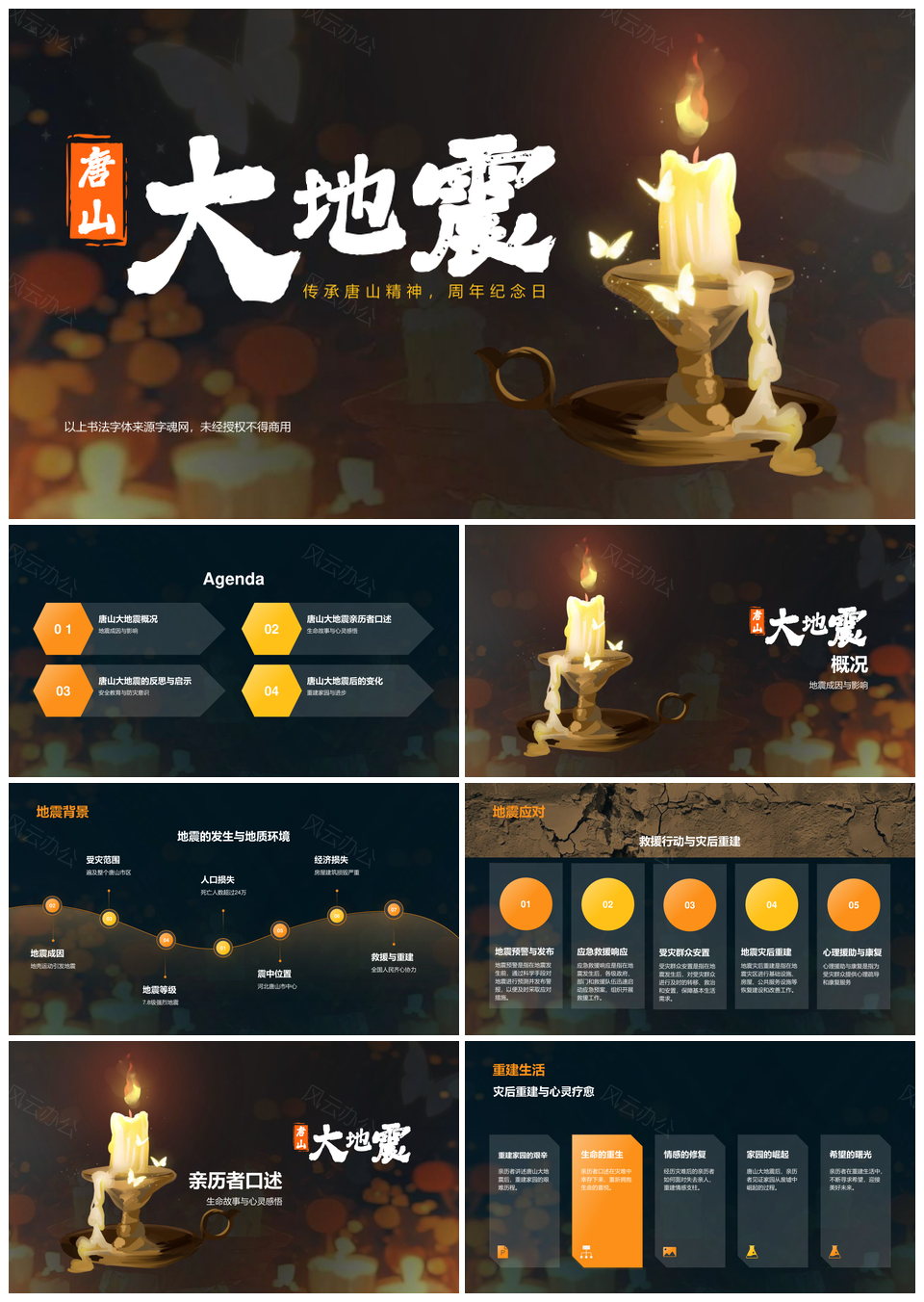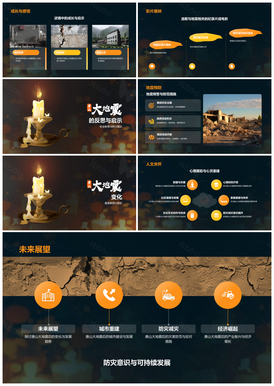 风云办公提供的唐山地震纪念防震教育讲座影片PPT模板,下载格式为pptx,一共15页,作品中文字及图均可以修改和编辑,图片更改请在作品中右键图片并更换,文字修改请直接点击文字进行修改。