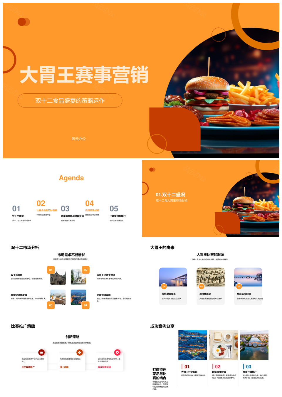 风云办公提供的双十二大胃王赛事餐饮品牌推广案例PPT模板,下载格式为pptx,一共28页,作品中文字及图均可以修改和编辑,图片更改请在作品中右键图片并更换,文字修改请直接点击文字进行修改。