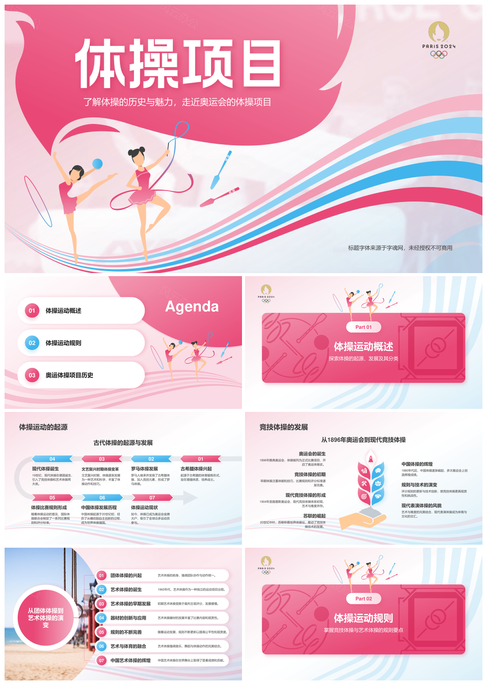 这是一张2025奥运体操竞技艺术历史规则器械科普PPT模板,包含2025奥运、体操、竞技、艺术、历史、规则、器械、科普等主题内容,也可用作奥运体操竞技艺术、体操竞技艺术历史、竞技艺术历史规则、艺术历史规则器械、历史规则器械科普、奥运体操竞技、体操竞技艺术、竞技艺术历史、艺术历史规则、历史规则器械、规则器械科普、奥运体操、体操竞技、竞技艺术、艺术历史等PPT场景使用。 风云办公提供的2025奥运体操竞技艺术历史规则器械科普PPT模板,下载格式为pptx,一共16页,作品中文字及图均可以修改和编辑,图片更改请在作品中右键图片并更换,文字修改请直接点击文字进行修改。