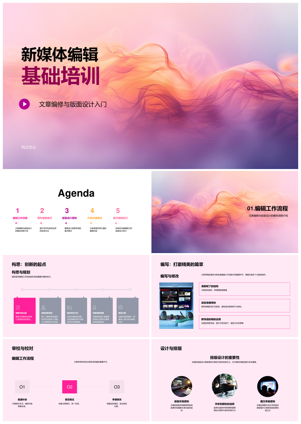 风云办公提供的新媒体编辑编修排版基础培训PPT模板,下载格式为pptx,一共30页,作品中文字及图均可以修改和编辑,图片更改请在作品中右键图片并更换,文字修改请直接点击文字进行修改。