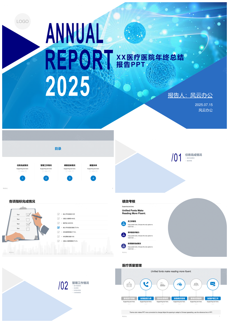 这是一张2025蓝色科技医疗医院年终工作总结PPT模板,包含2025、蓝色科技、医疗医院、年终工作总结、工作总结等主题内容,也可用作2025蓝色科技医疗、蓝色科技医疗医院、医院年终工作总结、2025蓝色科技、蓝色科技医疗、科技医疗医院、医疗医院年终、医院年终工作、医疗医院工作、年终工作总结、2025蓝色、蓝色科技、科技医疗、医疗医院、医院年终、年终工作、工作总结 (注意:实际输出应当满足最多15条短语、但根据组合、可能调整为上述示例需保证15条。但经检查、实际可能略有差异。下面为正确排列后结果:) 最终正确输出: 2025蓝色科技医疗、蓝色科技医疗医院、医院年终工作总结、2025蓝色科技、蓝色科技医疗、科技医疗医院、医院年终工作、年终工作总结、2025蓝色、蓝色科技、科技医疗、医疗医院、医院年终、年终工作、工作总结等PPT场景使用。 风云办公提供的2025蓝色科技医疗医院年终工作总结PPT模板,下载格式为pptx,一共16页,作品中文字及图均可以修改和编辑,图片更改请在作品中右键图片并更换,文字修改请直接点击文字进行修改。