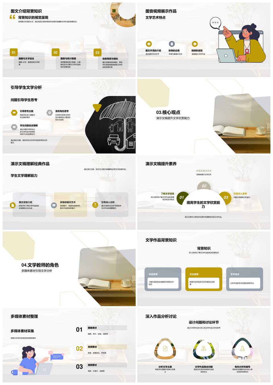 这是一张文学经典解析展现魅力启迪学生理解书籍之美PPT模板,包含文学经典、解析、展现、魅力、启迪、学生、理解、书籍之美等主题内容,也可用作文学经典解析展现魅力、经典解析展现魅力启迪、展现魅力启迪学生理解、魅力启迪学生理解书籍、文学经典解析展现、经典解析展现魅力、解析展现魅力启迪、展现魅力启迪学生、魅力启迪学生理解、启迪学生理解书籍、文学经典展现魅力、经典解析展现、解析展现魅力、展现魅力启迪、魅力启迪学生等PPT场景使用。 风云办公提供的文学经典解析展现魅力启迪学生理解书籍之美PPT模板,下载格式为pptx,一共18页,作品中文字及图均可以修改和编辑,图片更改请在作品中右键图片并更换,文字修改请直接点击文字进行修改。