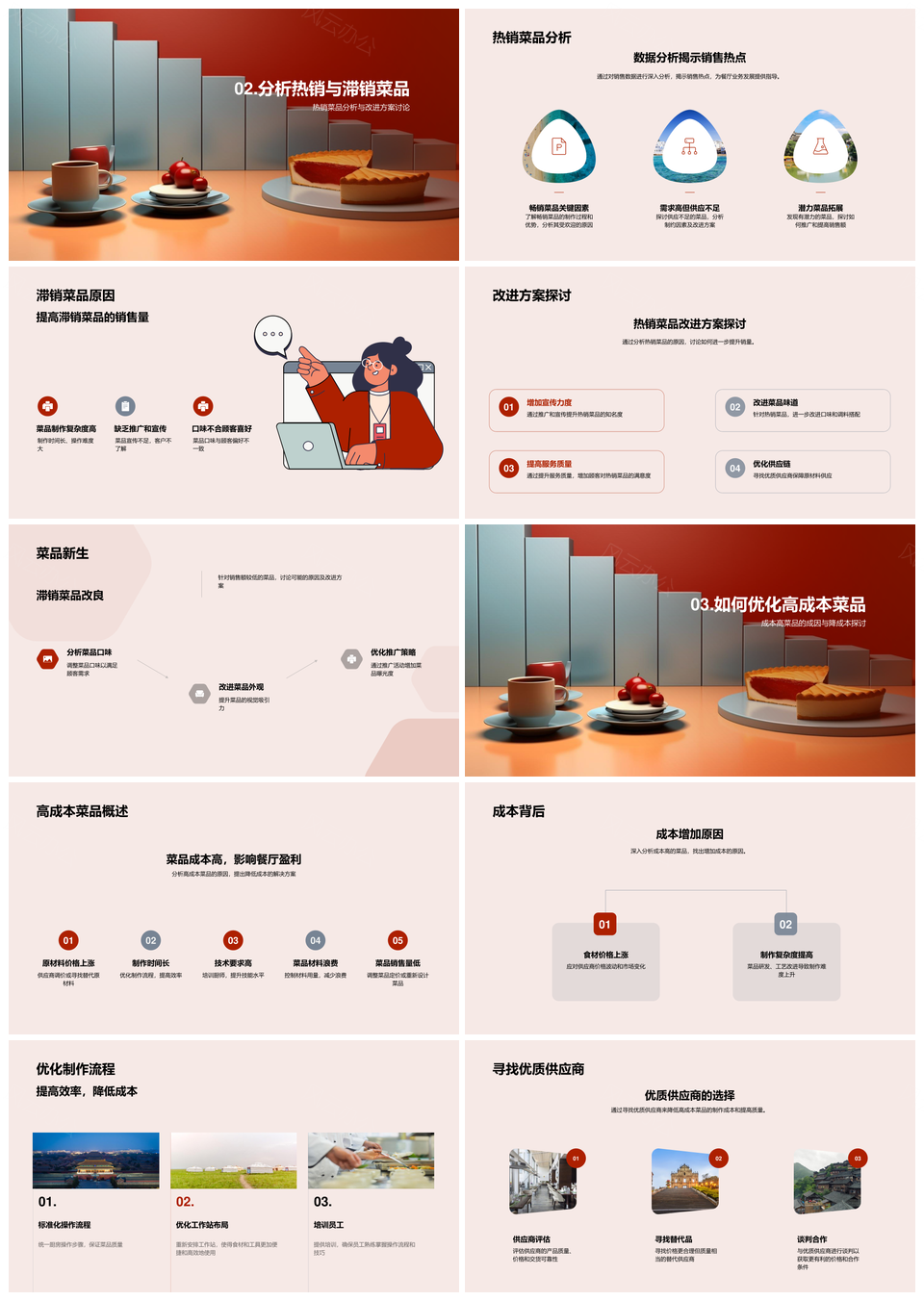 风云办公提供的餐饮热销菜品销售成本数据分析优化PPT模板,下载格式为pptx,一共28页,作品中文字及图均可以修改和编辑,图片更改请在作品中右键图片并更换,文字修改请直接点击文字进行修改。