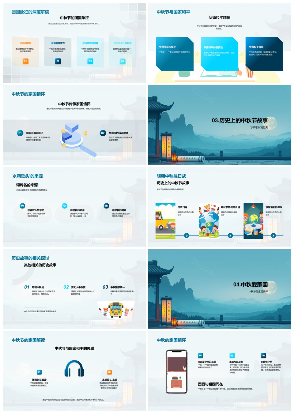 风云办公提供的中秋家国情怀团圆传统文人水调和平PPT模板,下载格式为pptx,一共23页,作品中文字及图均可以修改和编辑,图片更改请在作品中右键图片并更换,文字修改请直接点击文字进行修改。