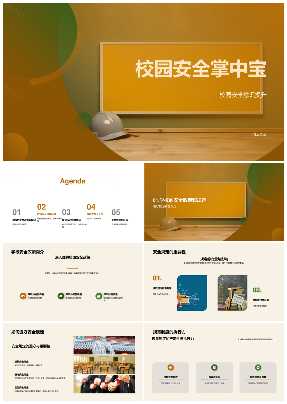 风云办公提供的校园安全教育政策风险应对安全手册PPT模板,下载格式为pptx,一共28页,作品中文字及图均可以修改和编辑,图片更改请在作品中右键图片并更换,文字修改请直接点击文字进行修改。