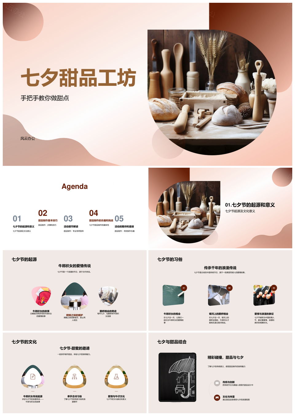 风云办公提供的七夕甜品工坊传统制作技巧与文化习俗PPT模板,下载格式为pptx,一共25页,作品中文字及图均可以修改和编辑,图片更改请在作品中右键图片并更换,文字修改请直接点击文字进行修改。