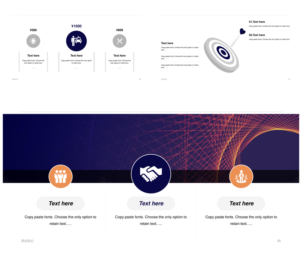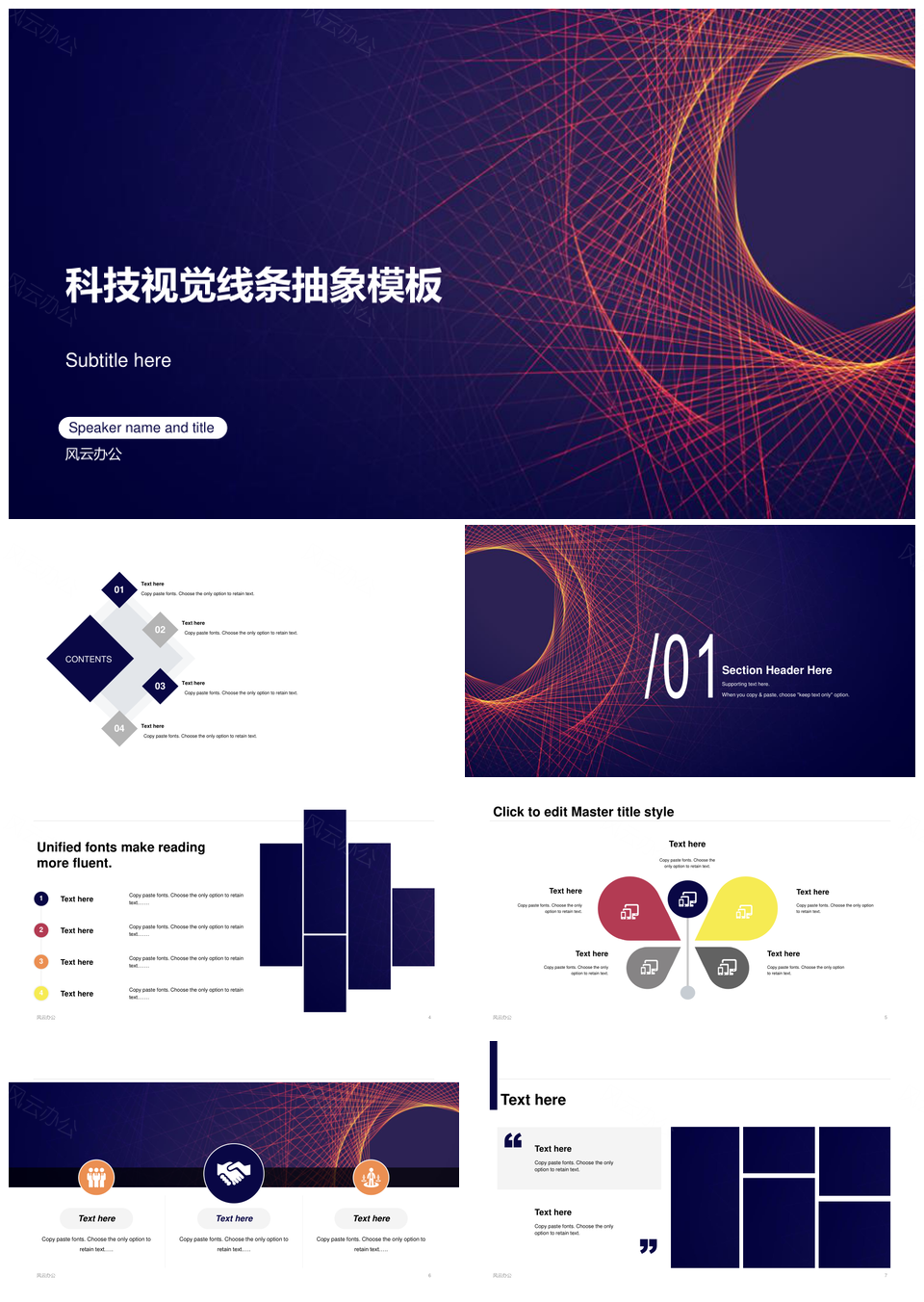 风云办公提供的科技视觉抽象线条多色创意商业企划PPT模板,下载格式为pptx,一共31页,作品中文字及图均可以修改和编辑,图片更改请在作品中右键图片并更换,文字修改请直接点击文字进行修改。