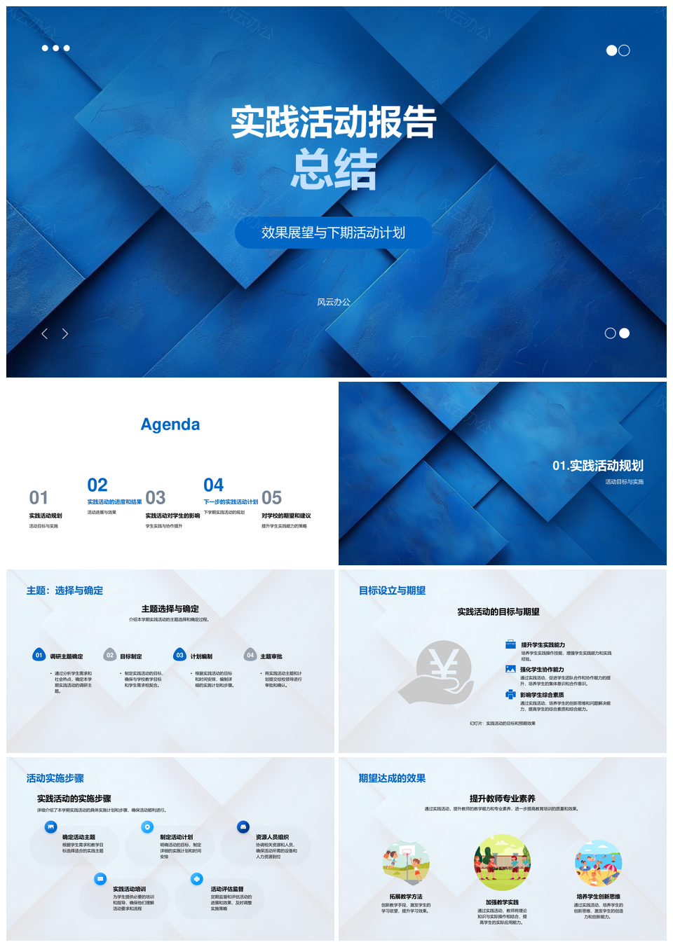 风云办公提供的实践活动总结规划实施协作提升展望PPT模板,下载格式为pptx,一共25页,作品中文字及图均可以修改和编辑,图片更改请在作品中右键图片并更换,文字修改请直接点击文字进行修改。