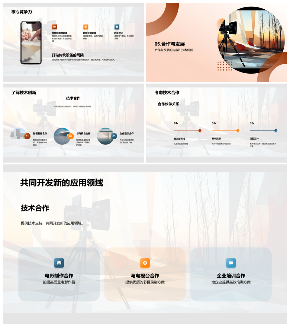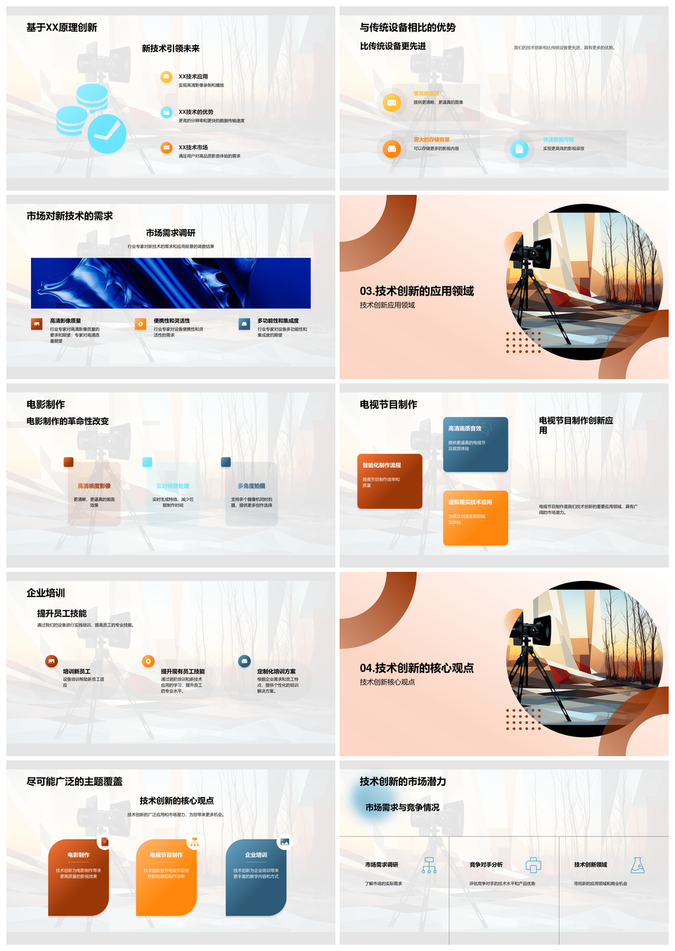 这是一张首席技术官团队研发XX原理革新电影摄影机PPT模板,包含首席技术官团队、研发、XX原理、革新、电影摄影机等主题内容,也可用作首席技术官团队研发XX原理、首席技术官团队研发革新、首席技术官团队革新电影摄影机、研发XX原理革新电影摄影机、首席技术官团队研发、首席技术官团队革新、团队研发XX原理、首席技术官研发XX原理、研发XX原理革新、XX原理革新电影摄影机、首席技术官团队、研发XX原理、团队研发、XX原理革新、革新电影摄影机等PPT场景使用。 风云办公提供的首席技术官团队研发XX原理革新电影摄影机PPT模板,下载格式为pptx,一共23页,作品中文字及图均可以修改和编辑,图片更改请在作品中右键图片并更换,文字修改请直接点击文字进行修改。