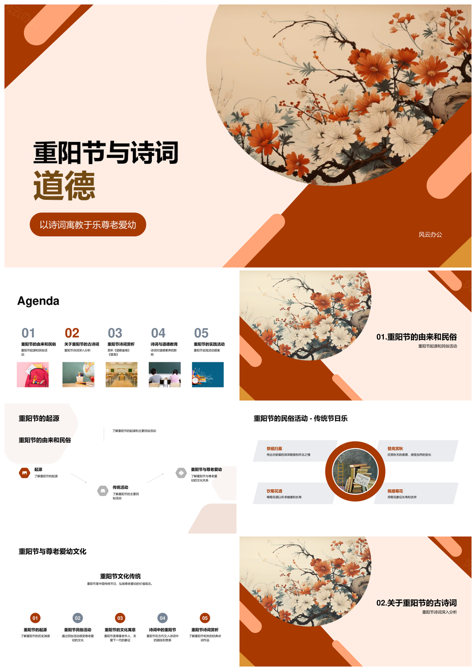 风云办公提供的重阳诗词尊老道德传统登高菊花赏析PPT模板,下载格式为pptx,一共23页,作品中文字及图均可以修改和编辑,图片更改请在作品中右键图片并更换,文字修改请直接点击文字进行修改。