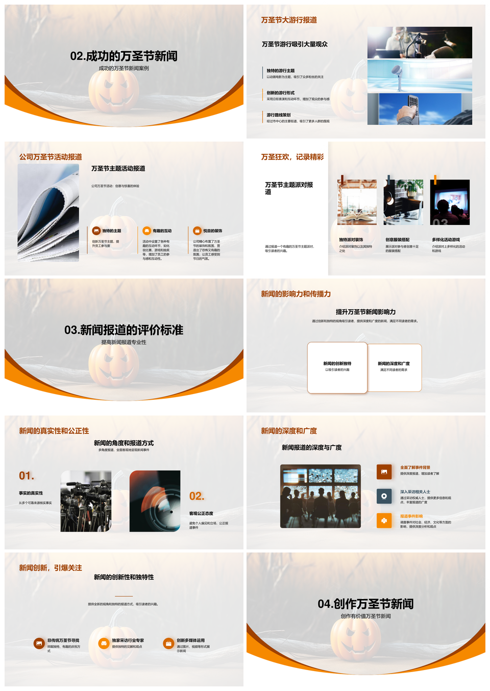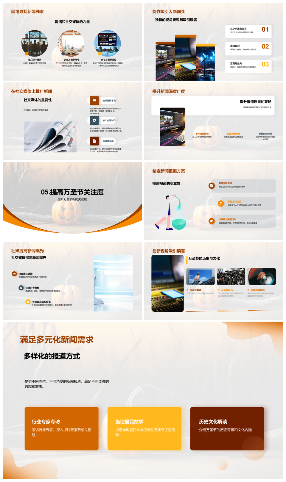 风云办公提供的万圣节新闻采编发推广与社交媒体应用PPT模板,下载格式为pptx,一共27页,作品中文字及图均可以修改和编辑,图片更改请在作品中右键图片并更换,文字修改请直接点击文字进行修改。