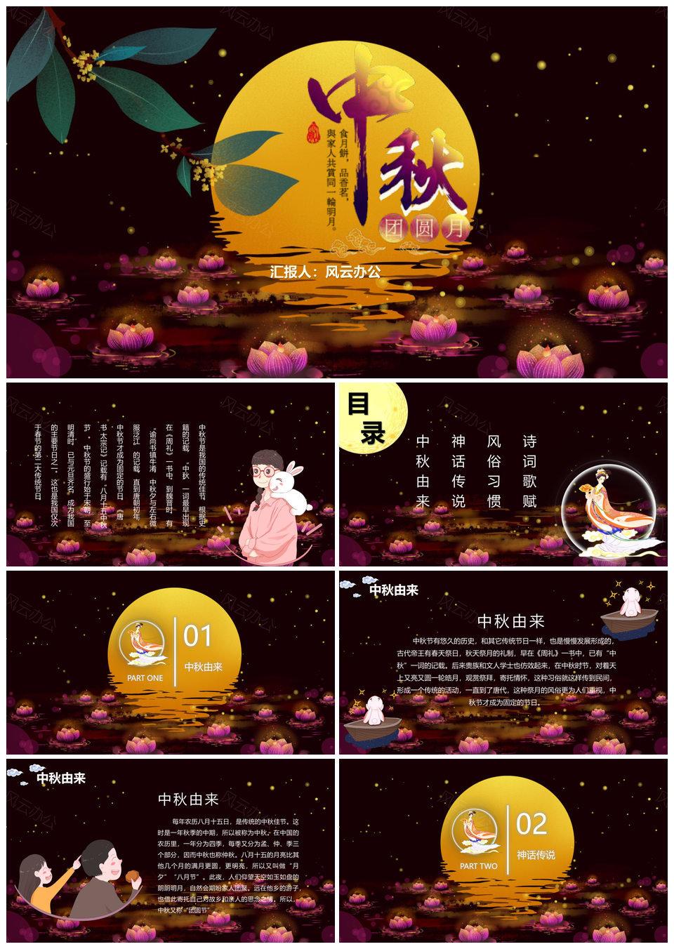 这是一张唯美风中秋节介绍PPT模板,包含唯美风、中秋节等主题内容,也可用作词语:唯美风、中秋节、介绍 短语:唯美风中秋节介绍、唯美风中秋节、唯美风介绍、中秋节介绍等PPT场景使用。 风云办公提供的唯美风中秋节介绍PPT模板,下载格式为pptx,一共10页,作品中文字及图均可以修改和编辑,图片更改请在作品中右键图片并更换,文字修改请直接点击文字进行修改。
