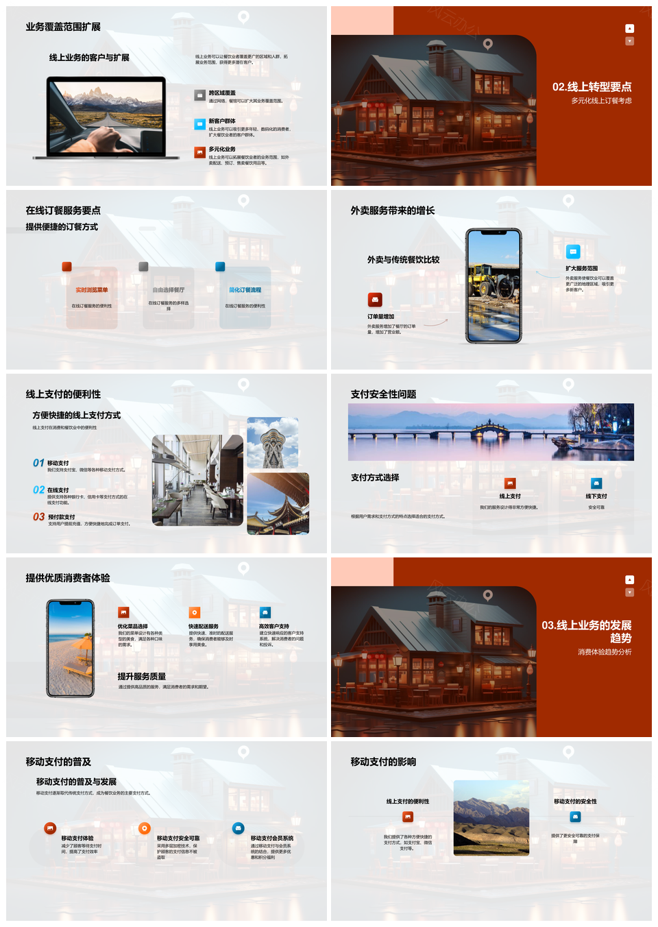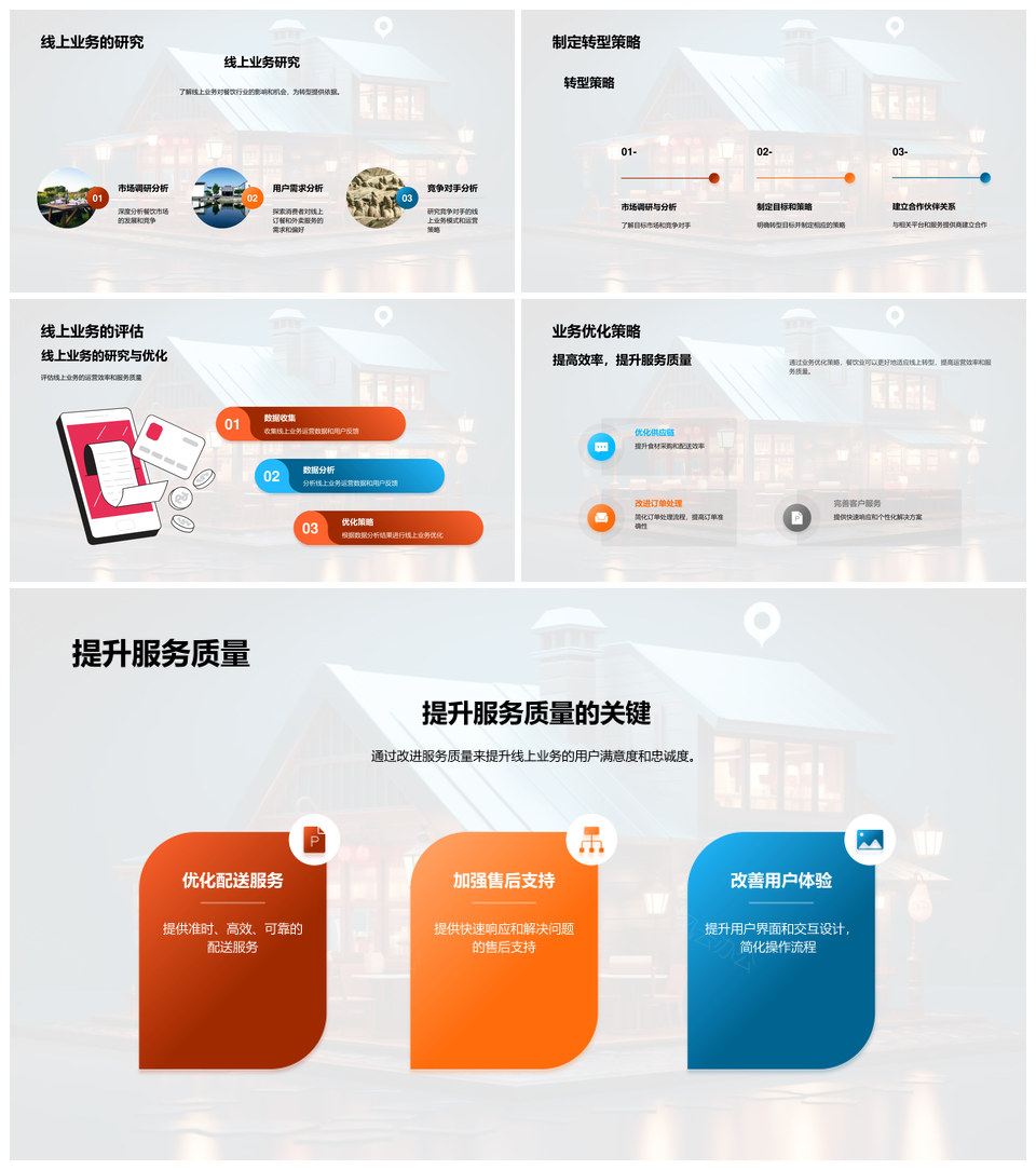这是一张餐饮业线上转型策略优化订餐外卖支付服务PPT模板,包含餐饮业、线上、转型、策略、优化、订餐、外卖、支付、服务等主题内容,也可用作餐饮业线上转型策略优化、线上转型策略优化订餐、转型策略优化订餐外卖、策略优化订餐外卖支付、优化订餐外卖支付服务、订餐外卖支付服务、餐饮业线上转型策略、线上转型策略优化订餐、转型策略优化订餐外卖支付、策略优化订餐外卖支付服务、餐饮业线上转型、线上转型策略、转型策略优化、策略优化订餐、优化订餐外卖等PPT场景使用。 风云办公提供的餐饮业线上转型策略优化订餐外卖支付服务PPT模板,下载格式为pptx,一共33页,作品中文字及图均可以修改和编辑,图片更改请在作品中右键图片并更换,文字修改请直接点击文字进行修改。