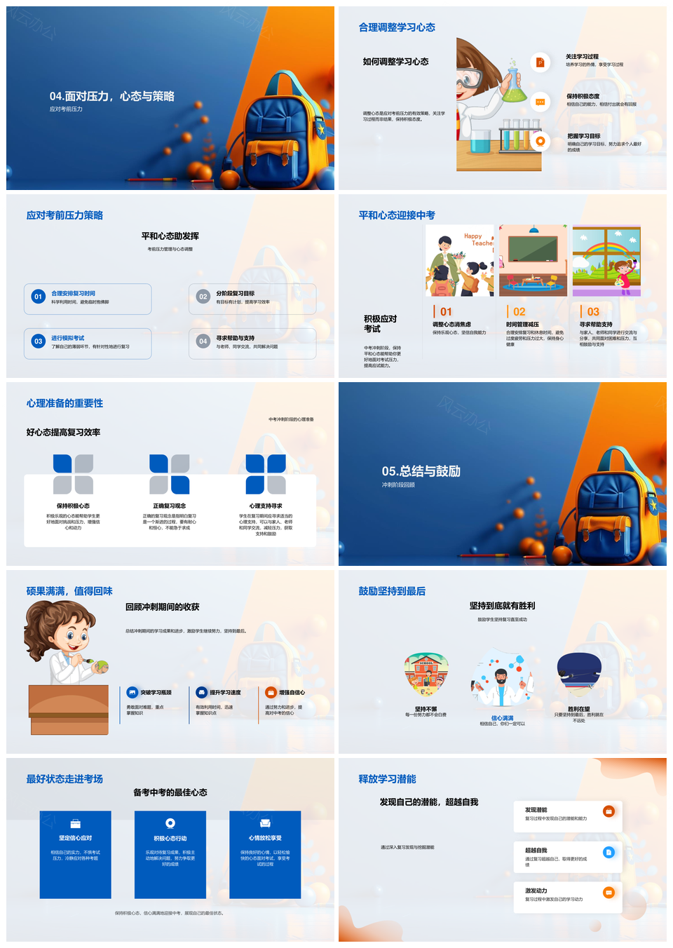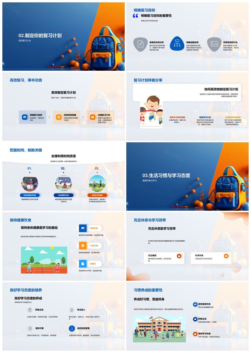 这是一张中考冲刺健康提分复习计划饮食休息心理准备PPT模板,包含中考、冲刺、健康、提分、复习计划、饮食、休息、心理、准备等主题内容,也可用作中考冲刺健康提分复习计划饮食休息、健康提分复习计划饮食休息心理准备、中考冲刺复习计划饮食休息心理准备、复习计划饮食休息心理准备、中考冲刺健康提分复习计划饮食、健康提分复习计划饮食休息心理、中考冲刺健康提分复习、冲刺健康提分复习计划、中考冲刺健康提分、健康提分复习计划、复习计划饮食休息、饮食休息心理准备、中考冲刺复习计划、冲刺健康提分、提分复习计划、计划饮食休息、休息心理准备等PPT场景使用。 风云办公提供的中考冲刺健康提分复习计划饮食休息心理准备PPT模板,下载格式为pptx,一共28页,作品中文字及图均可以修改和编辑,图片更改请在作品中右键图片并更换,文字修改请直接点击文字进行修改。