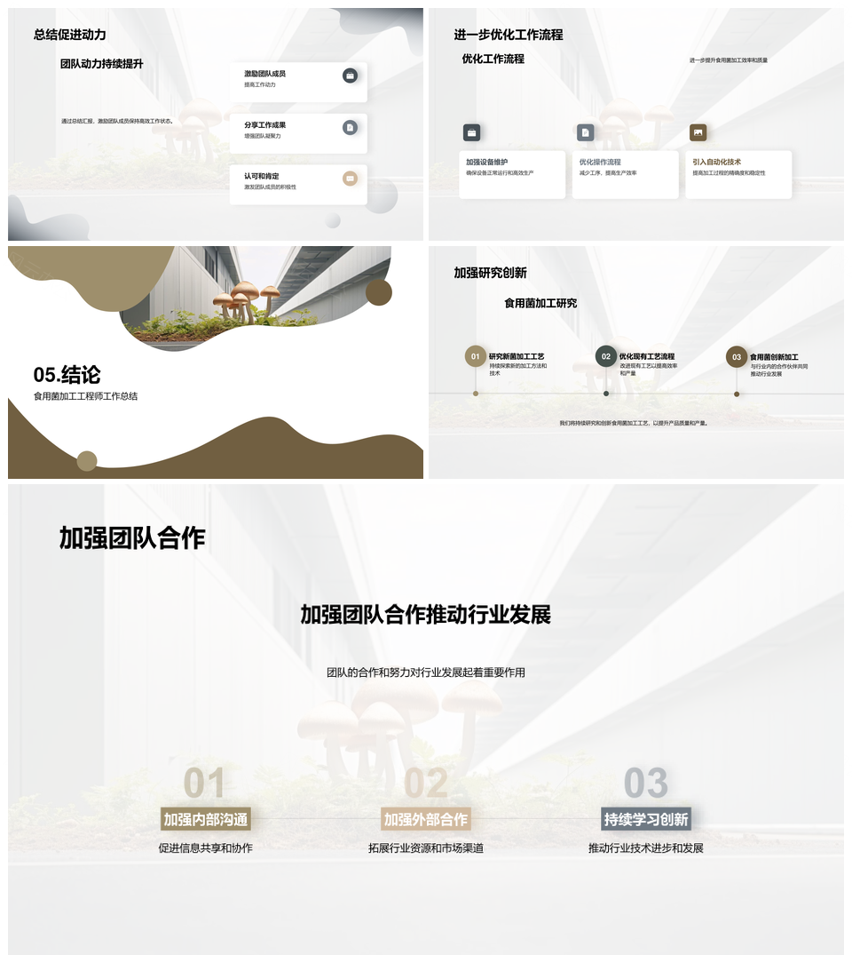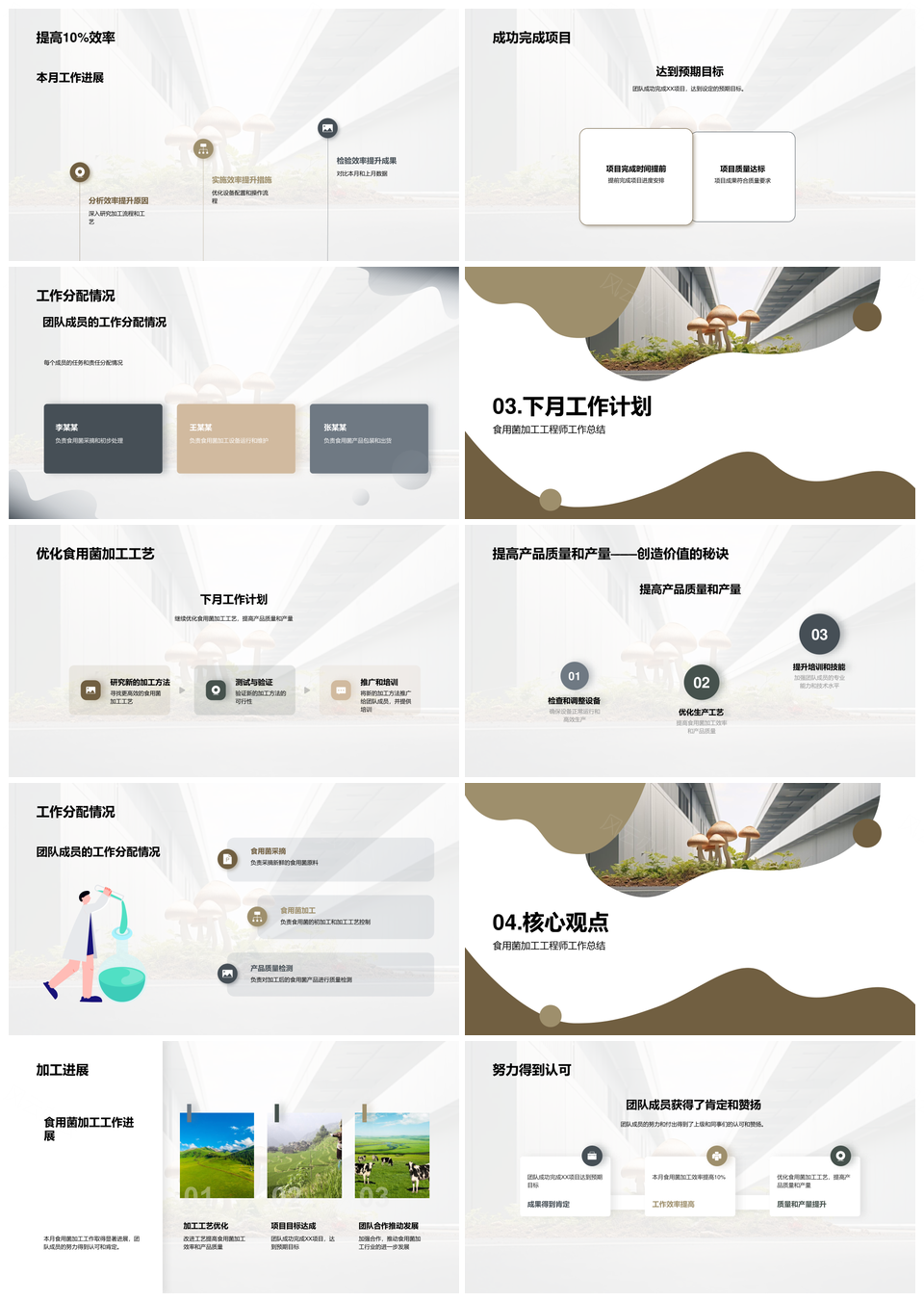 风云办公提供的工程师团队月度总结蘑菇加工效率提升PPT模板,下载格式为pptx,一共23页,作品中文字及图均可以修改和编辑,图片更改请在作品中右键图片并更换,文字修改请直接点击文字进行修改。