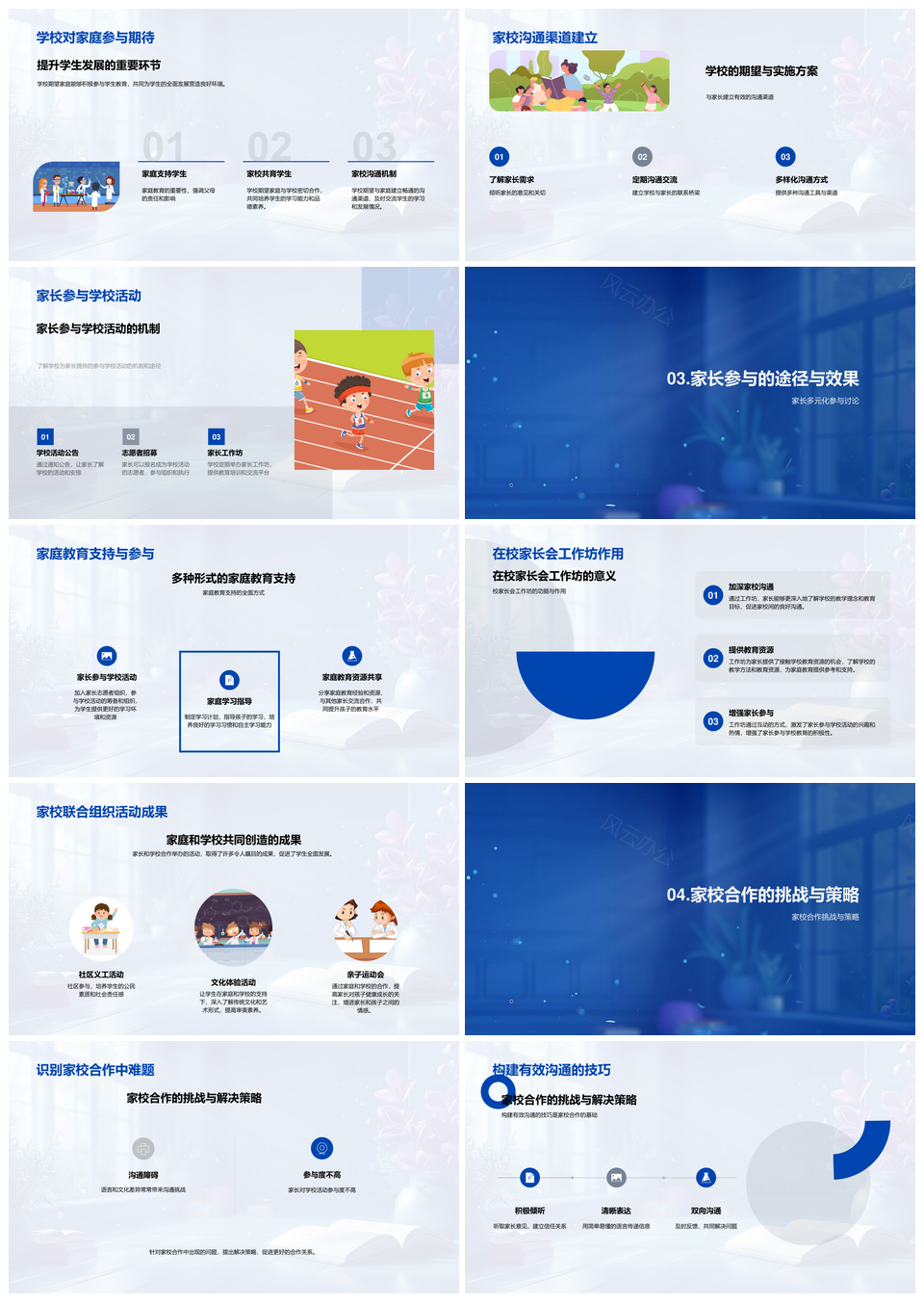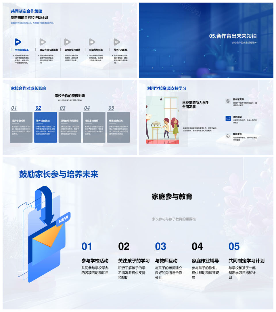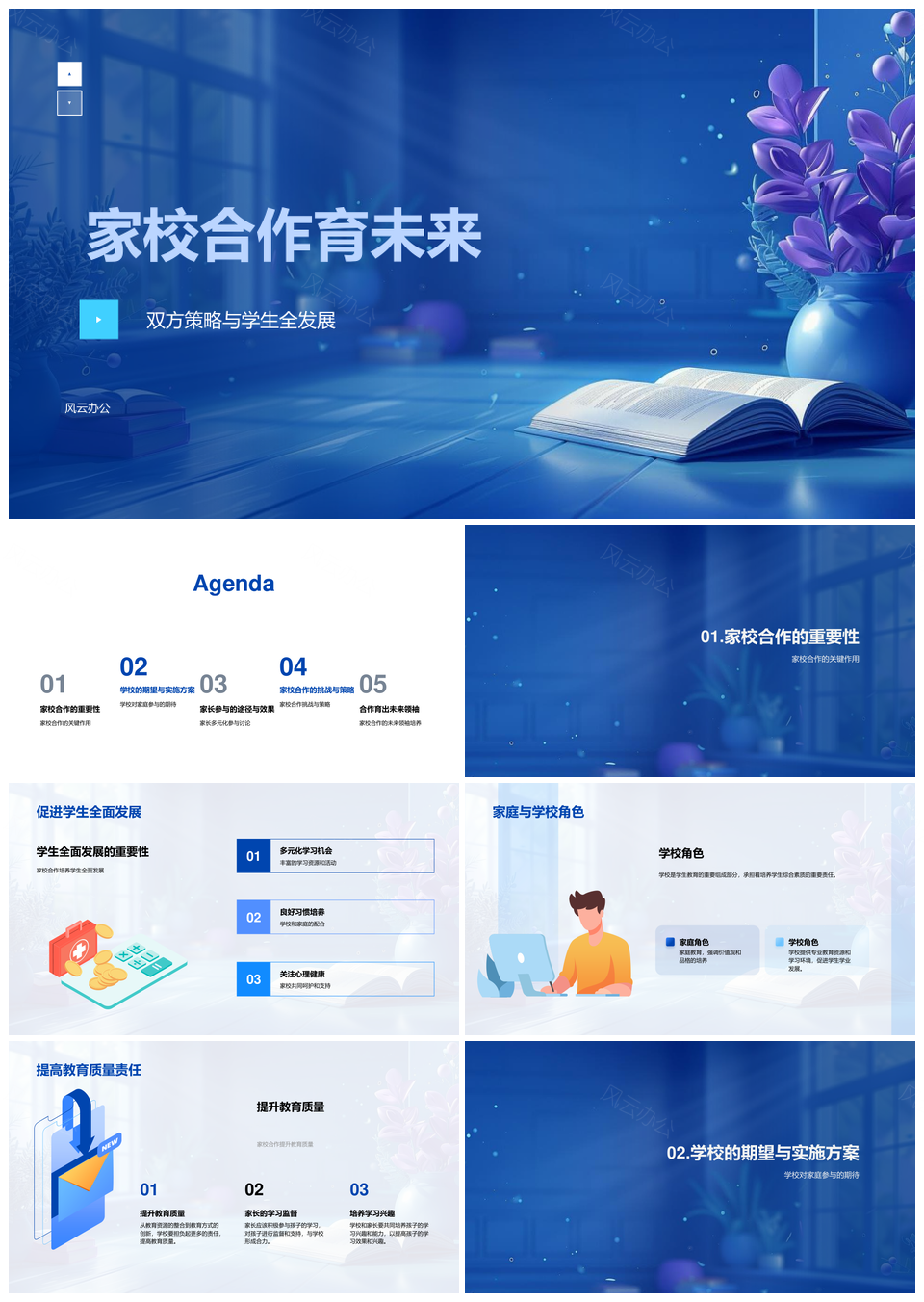 风云办公提供的家校合作共促学生全发展教育PPT模板,下载格式为pptx,一共23页,作品中文字及图均可以修改和编辑,图片更改请在作品中右键图片并更换,文字修改请直接点击文字进行修改。