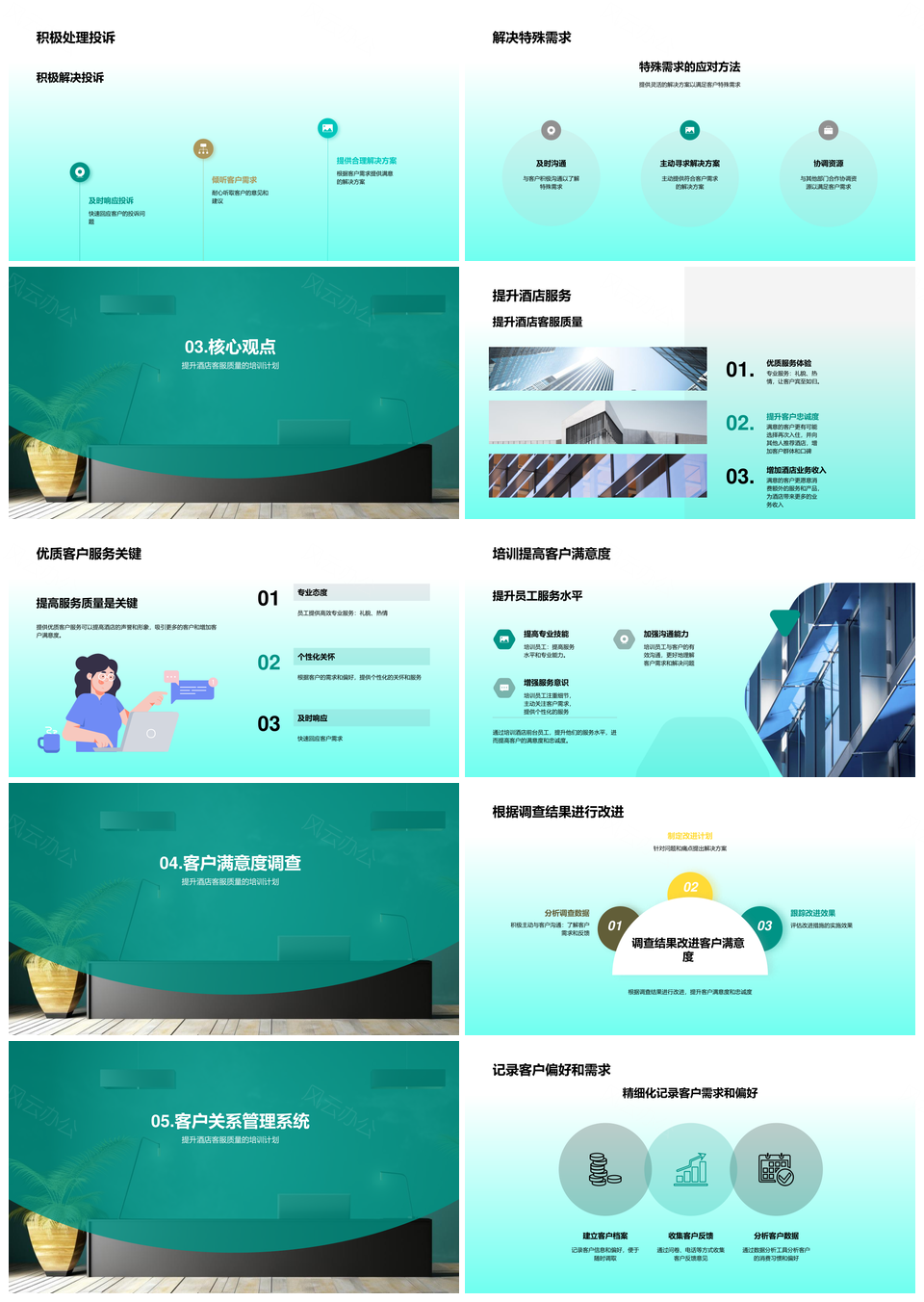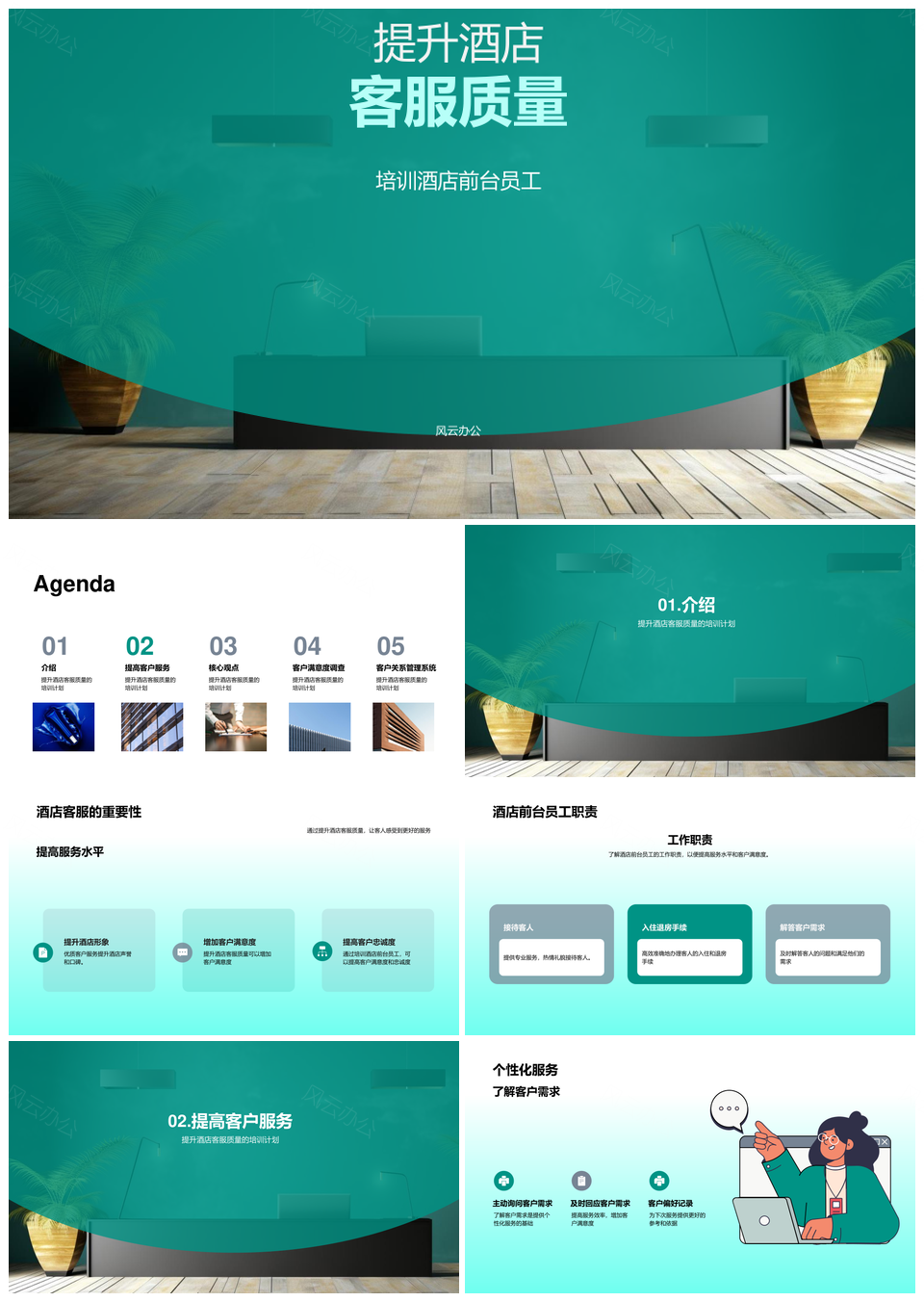 专为酒店前台培训场景打造的现代风PPT模板,设计强调信息传达效率与视觉逻辑。主色调选用墨绿、藏蓝与哑光白,传递专业信赖感的同时融入极简线条与淡色光斑装饰,呼应科技行业的波粒动态美感。模块化布局适配服务流程拆解、礼仪标准演示等核心板块,灵活支持图表、示意图及三维模型等素材插入。激光切割式分隔线优化层级区分,波纹底纹平衡页面呼吸感,确保复杂知识点呈现清晰有序。适用于服务标准内训、技能考核汇报等专业场景。