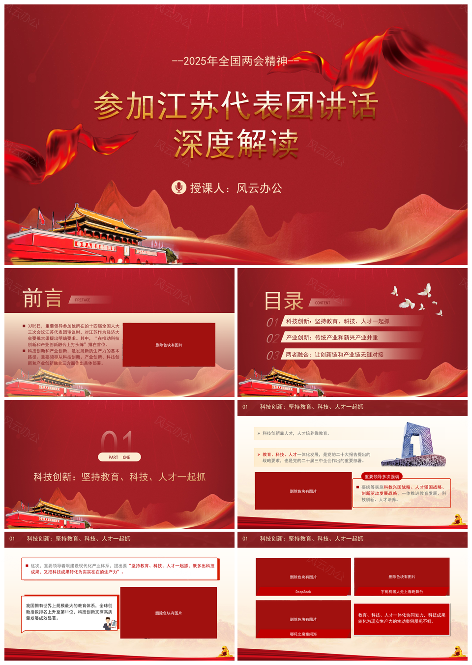 这是一张2025重要领导参加江苏代表团审议经济大省挑大梁创新党课PPT模板,包含2025、重要领导、参加、江苏代表团、审议、经济大省、挑大梁、创新党课等主题内容,也可用作2025重要领导参加江苏代表团、重要领导参加江苏代表团审议、江苏代表团审议经济大省、审议经济大省挑大梁创新、经济大省挑大梁创新党课、参加江苏代表团审议经济、代表团审议经济大省挑大梁、重要领导参加经济大省、江苏代表团挑大梁创新、经济大省创新党课、挑大梁创新党课、重要领导审议经济大省、代表团审议挑大梁创新、2025江苏代表团审议、重要领导参加江苏代表团挑大梁等PPT场景使用。 风云办公提供的2025重要领导参加江苏代表团审议经济大省挑大梁创新党课PPT模板,下载格式为pptx,一共16页,作品中文字及图均可以修改和编辑,图片更改请在作品中右键图片并更换,文字修改请直接点击文字进行修改。