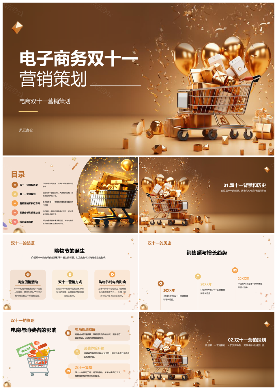 风云办公提供的黄色金色电商双十一促销策划PPT模板,下载格式为pptx,一共24页,作品中文字及图均可以修改和编辑,图片更改请在作品中右键图片并更换,文字修改请直接点击文字进行修改。