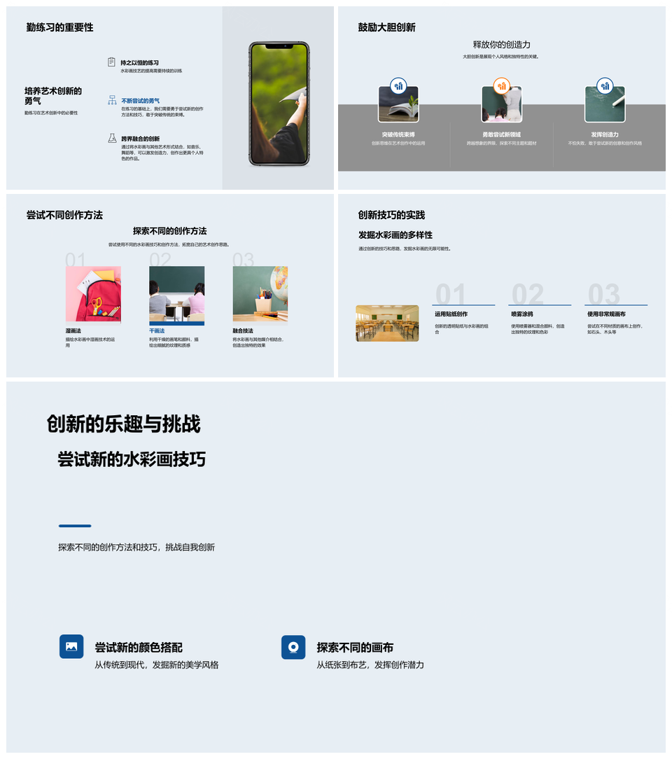 这是一张水彩世界探索技法色彩鲜明湿度浓淡调色盘PPT模板,包含水彩世界、探索、技法、色彩、鲜明、湿度、浓淡、调色盘等主题内容,也可用作水彩世界探索技法、世界探索技法色彩、探索技法色彩鲜明、技法色彩鲜明湿度、色彩鲜明湿度浓淡、鲜明湿度浓淡调色盘、水彩世界探索、世界探索技法、探索技法色彩、技法色彩鲜明、色彩鲜明湿度、鲜明湿度浓淡、湿度浓淡调色盘、水彩世界、世界探索等PPT场景使用。 风云办公提供的水彩世界探索技法色彩鲜明湿度浓淡调色盘PPT模板,下载格式为pptx,一共33页,作品中文字及图均可以修改和编辑,图片更改请在作品中右键图片并更换,文字修改请直接点击文字进行修改。