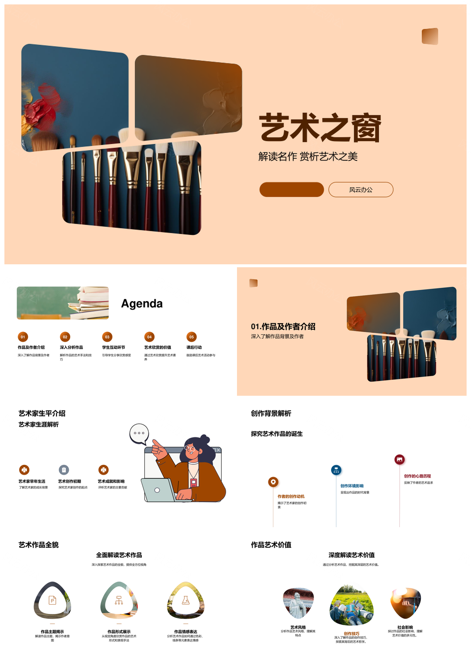 风云办公提供的艺术之窗名作艺术之美创作技巧赏析PPT模板,下载格式为pptx,一共28页,作品中文字及图均可以修改和编辑,图片更改请在作品中右键图片并更换,文字修改请直接点击文字进行修改。