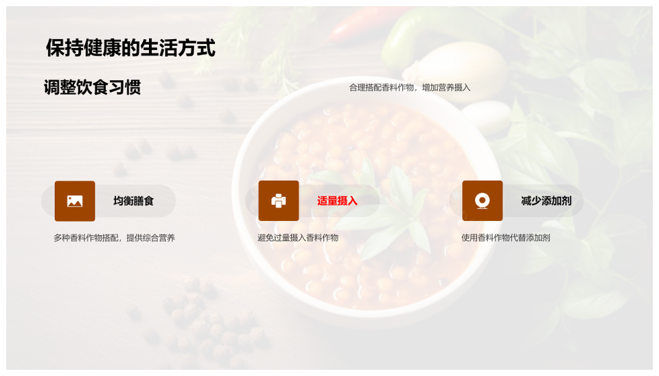 风云办公提供的香料作物健康益处与保健作用专家解析PPT模板,下载格式为pptx,一共39页,作品中文字及图均可以修改和编辑,图片更改请在作品中右键图片并更换,文字修改请直接点击文字进行修改。