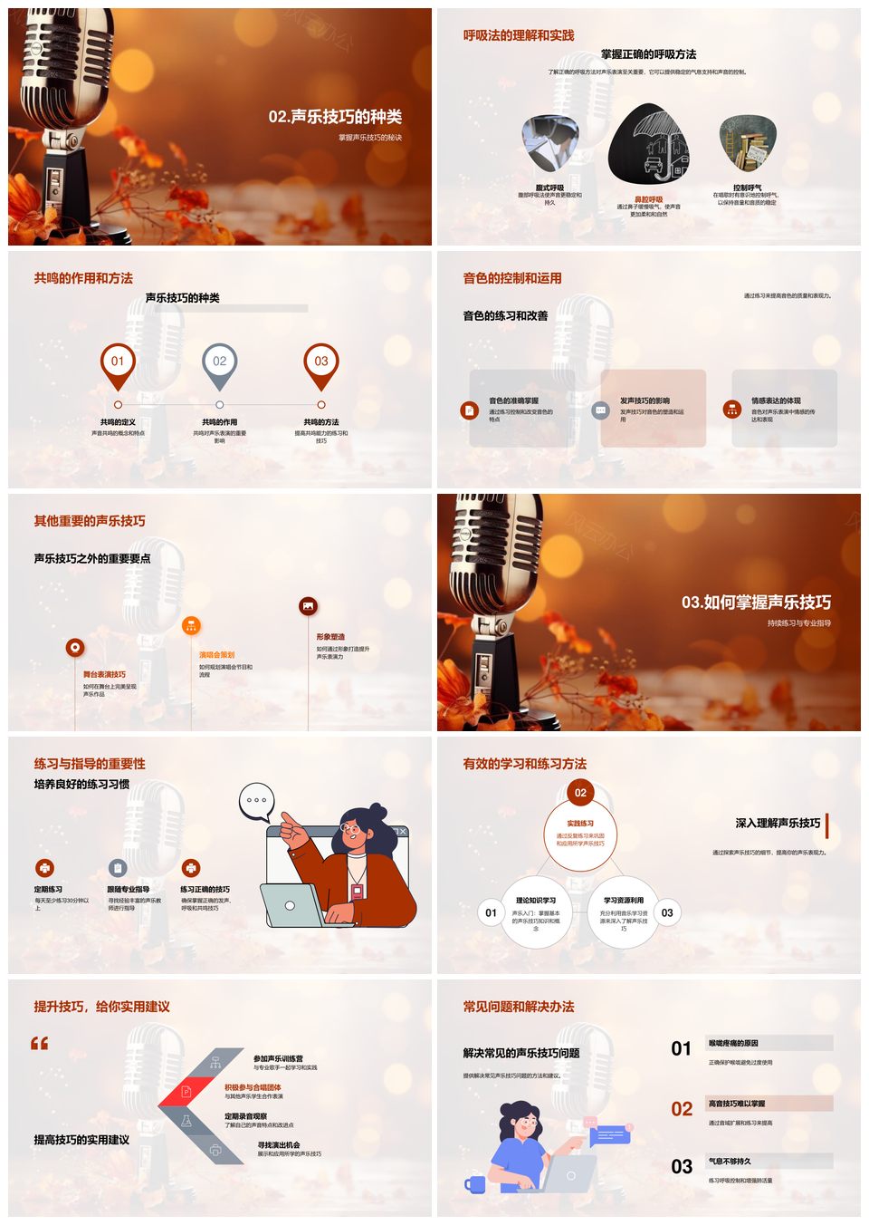 这是一张声乐技巧呼吸共鸣音色控制与表演提升PPT模板,包含声乐技巧、呼吸、共鸣、音色控制、表演提升等主题内容,也可用作声乐技巧呼吸共鸣、呼吸共鸣音色控制、音色控制表演提升、声乐技巧呼吸、技巧呼吸共鸣、呼吸共鸣音色、共鸣音色控制、音色控制表演、控制表演提升、声乐技巧、呼吸共鸣、共鸣音色、音色控制、控制表演、表演提升等PPT场景使用。
