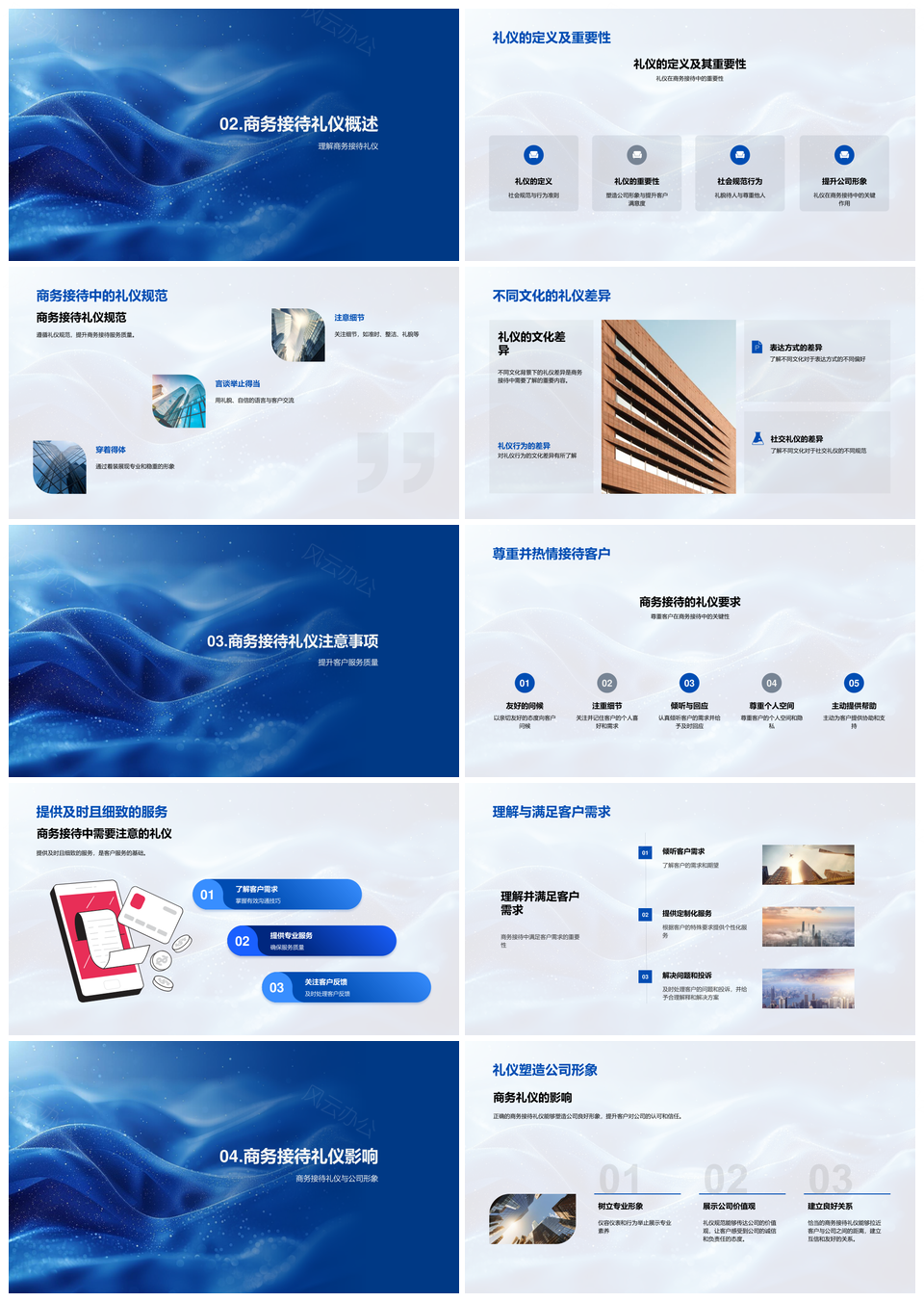 这是一张商务接待礼仪优化服务形象提升PPT模板,包含商务接待、礼仪、优化、服务形象、提升等主题内容,也可用作商务接待礼仪优化、优化服务形象提升、商务接待礼仪、接待礼仪优化、礼仪优化服务、优化服务形象、服务形象提升、商务接待、接待礼仪、礼仪优化、优化服务、服务形象、形象提升、商务礼仪、服务提升等PPT场景使用。 风云办公提供的商务接待礼仪优化服务形象提升PPT模板,下载格式为pptx,一共24页,作品中文字及图均可以修改和编辑,图片更改请在作品中右键图片并更换,文字修改请直接点击文字进行修改。