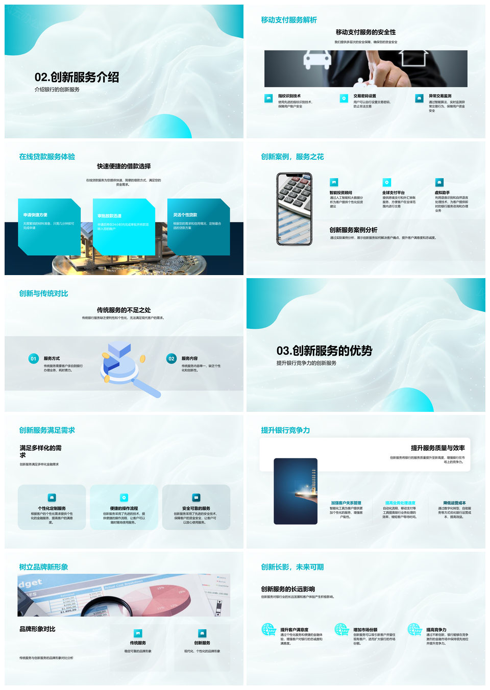 风云办公提供的银行新型服务趋势与移动金融创新提升PPT模板,下载格式为pptx,一共23页,作品中文字及图均可以修改和编辑,图片更改请在作品中右键图片并更换,文字修改请直接点击文字进行修改。