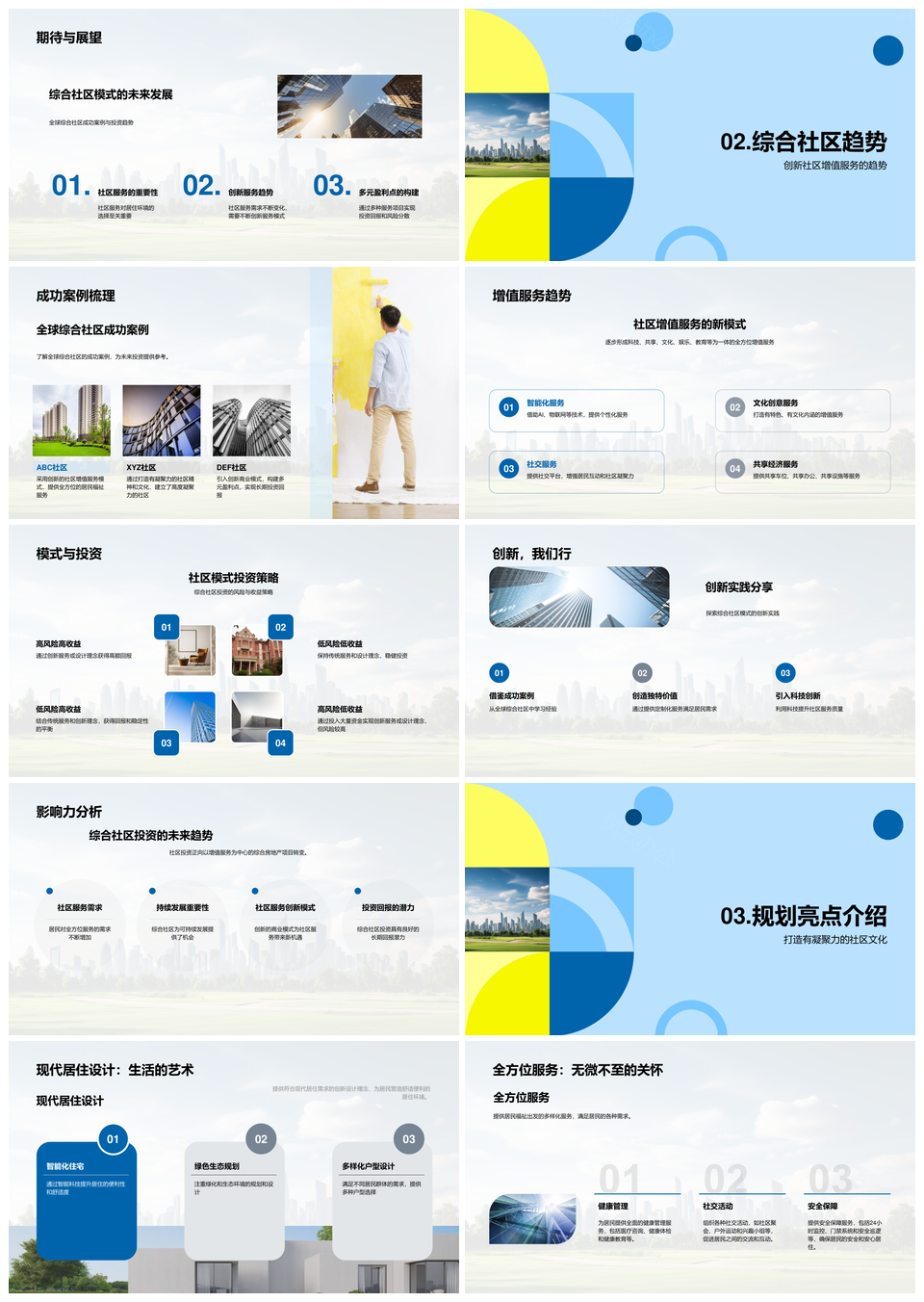 这是一张综合社区创新服务提升摩天大楼生活品质PPT模板,包含综合、社区、创新服务、提升、摩天大楼、生活品质等主题内容,也可用作综合社区创新服务、社区创新服务提升、创新服务提升摩天大楼、服务提升摩天大楼生活、提升摩天大楼生活品质、综合社区创新、社区创新服务、创新服务提升、服务提升摩天大楼、提升摩天大楼生活、摩天大楼生活品质、综合社区、社区创新、创新服务、服务提升等PPT场景使用。 风云办公提供的综合社区创新服务提升摩天大楼生活品质PPT模板,下载格式为pptx,一共33页,作品中文字及图均可以修改和编辑,图片更改请在作品中右键图片并更换,文字修改请直接点击文字进行修改。